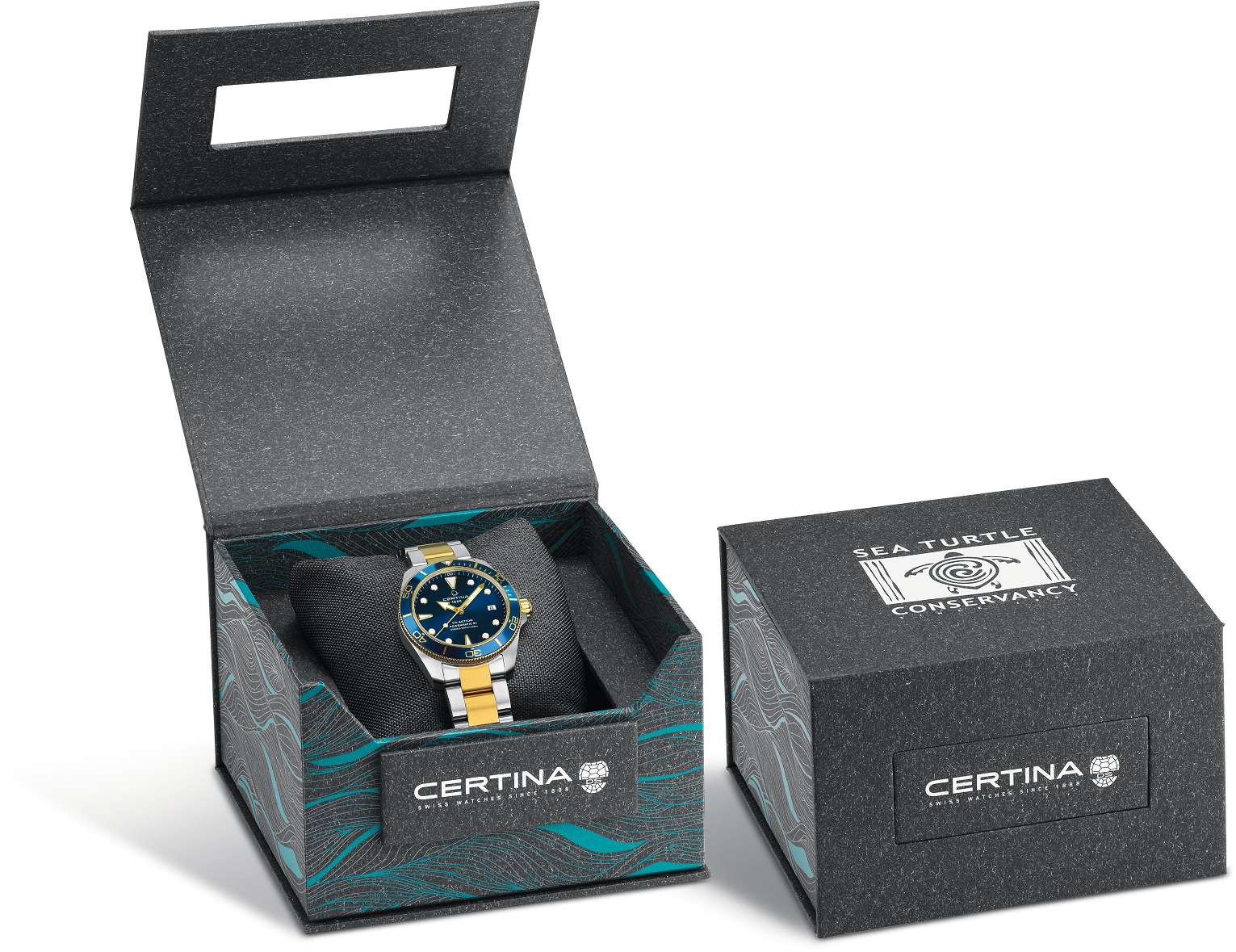 Certina DS Action Diver Sea Turtle Conservancy Special Edition C032.807.22.041.10 sú automatické hodinky na kovovom bicolor náramku s preklápacou sponou. Puzdro z nerezovej ocele má priemer 38 milimetrov a viečko značené logom Sea Turtle Conservancy, s ktorou bola táto špeciálna edícia pripravovaná. Hodinky sú vybavené jednosmerne otočnou lunetou v zlatej povrchovej PVD úprave s hliníkovou vložkou s potápačskou stupnicou. Modrý číselník s efektom slnečného brusu a indikáciou dátumu je chránený odolným zafírovým sklom s antireflexnou vrstvou. Aplikované hodinové indexy sú spolu s ručičkami pokryté luminiscenčným náterom Super-LumiNova®, ktorý garantuje perfektnú čitateľnosť za zhoršených svetelných podmienok. Pohon hodiniek zaisťuje mechanický strojček Powermatic 80.611 s automatickým náťahom a rezervou chodu približne 80 hodín. Kaliber je vybavený vláskom zotrvačky Nivachron, čo je špeciálny antimagnetický materiál, vďaka ktorému sú hodinky veľmi odolné voči magnetickým poliam. Tento strojček s funkciou hackingu je možné v prípade potreby naťahovať aj ručne pomocou skrutkovacej korunky. Model disponuje technológiou DS (Double Security) používanou a zdokonaľovanou už od roku 1959, vďaka ktorej majú hodinky zvýšenú odolnosť voči nárazom a vode. Vodotesnosť hodiniek je 30 ATM a s certifikáciou ISO 6425 sú vhodnou voľbou pre prístrojové potápanie.