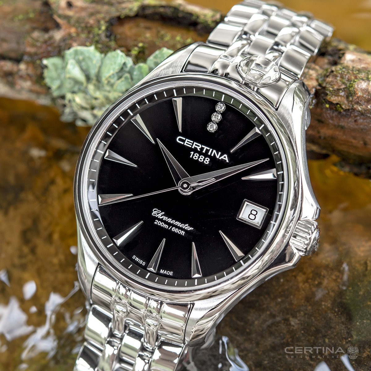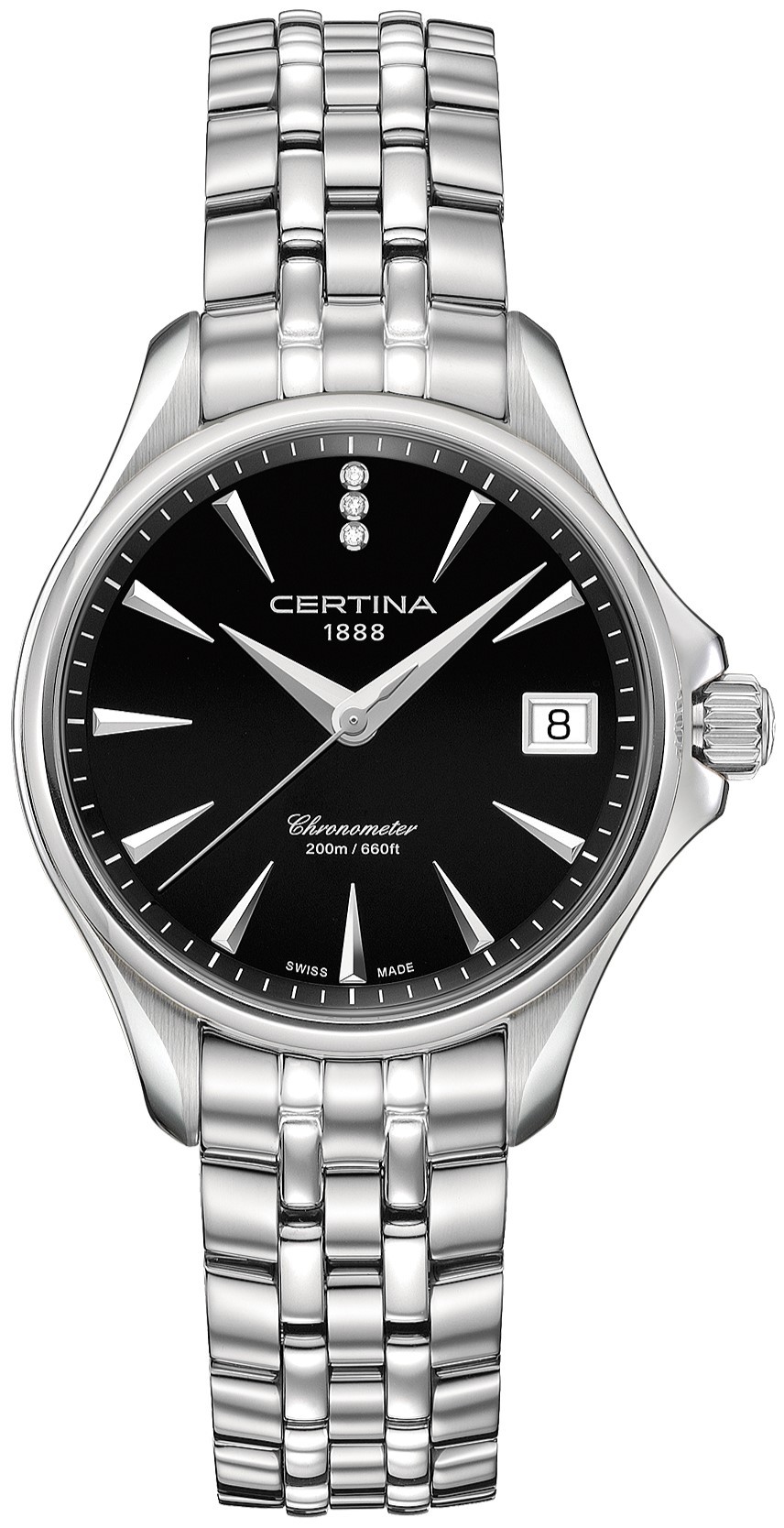 Certina DS Action Lady Chronometer C032.051.11.056.00 sú dámske batériové hodinky na oceľovom náramku s motýlikovou sponou. Puzdro z nerezovej ocele má priemer 33,8 milimetra, skrutkovaciu korunku a viečko značené logom v tvare korytnačky, ktoré reprezentuje robustnosť a dlhú životnosť hodiniek Certina. Čierny číselník s indikáciou dáta je chránený odolným zafírovým sklom s antireflexnou vrstvou. Aplikované hodinové indexy dopĺňajú elegantné výrazné ručičky a tri diamanty na dvanástej hodine. Pohon hodiniek zaisťuje spoľahlivý quartzový strojček ETA F06.411 s technológiou Precidrive s presnosťou +/- 10 sekúnd za rok a indikáciou slabej batérie. Hodinky s C.O.S.C. certifikáciou, ktorá je zárukou vysokej presnosti, nesú označenie „Chronometer“. Model disponuje technológiou DS (Double Security) používanou a zdokonaľovanou už od roku 1959, vďaka ktorej majú hodinky zvýšenú odolnosť voči nárazom a vode. Vodotesnosť hodiniek robí 20 ATM a sú teda vhodnou voľbou na šnorchlovanie a potápanie.