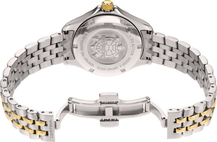 Certina DS Action Lady Chronometer C032.051.44.046.00 sú dámske batériové hodinky na titánovom bicolor náramku s motýlikovou sponou. Puzdro z titánu má priemer 33,8 milimetra, skrutkovaciu korunku, vonkajšiu lunetu s PVD úpravou vo farbe zlata a viečko značené logom v tvare korytnačky, ktoré reprezentuje robustnosť a dlhú životnosť hodiniek Certina. Svetlomodrý číselník s efektom slnečného brusu a indikáciou dátumu je chránený odolným zafírovým sklom s antireflexnou vrstvou. Aplikované hodinové indexy dopĺňajú elegantné výrazné ručičky a tri diamanty na dvanástej hodine. Pohon hodiniek zaisťuje spoľahlivý quartzový strojček ETA F06.412 s presnosťou +/- 10 sekúnd za rok a indikáciou slabej batérie. Hodinky s C.O.S.C. certifikáciou, ktorá je zárukou vysokej presnosti, nesú označenie „Chronometer“. Model disponuje technológiou DS (Double Security) používanou a zdokonaľovanou už od roku 1959, vďaka ktorej majú hodinky zvýšenú odolnosť voči nárazom a vode. Vodotesnosť hodiniek robí 20 ATM a sú teda vhodnou voľbou na šnorchlovanie a potápanie.