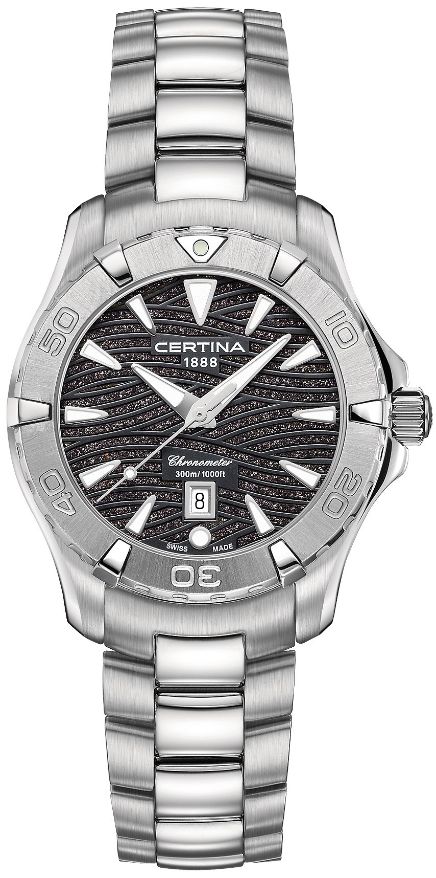 Certina DS Action Lady Chronometer C032.251.11.051.09 sú dámske batériové hodinky na kovovom náramku s preklápacou sponou. Puzdro z nerezovej ocele v kombinácii brusu a lesku má priemer 34,3 milimetra, skrutkovaciu korunku a jednosmerne otočnú lunetu s leštenými prvkami alebo satinovaním a potápačskou stupnicou. Viečko značené logom v tvare korytnačky reprezentuje robustnosť a dlhú životnosť hodiniek Certina. Čierny číselník s trblietavým motívom vĺn a indikáciou dáta je chránený odolným zafírovým sklom s antireflexnou vrstvou. Aplikované hodinové indexy sú spolu s ručičkami pokryté luminiscenčným náterom Super-LumiNova®, ktorý garantuje perfektnú čitateľnosť za zhoršených svetelných podmienok. Pohon hodiniek zaisťuje spoľahlivý quartzový strojček ETA F04.411 s technológiou Precidrive s presnosťou +/- 10 sekúnd za rok a indikáciou slabej batérie. Hodinky s C.O.S.C. certifikáciou, ktorá je zárukou vysokej presnosti, nesú označenie „Chronometer“. Model disponuje technológiou DS (Double Security) používanou a zdokonaľovanou už od roku 1959, vďaka ktorej majú hodinky zvýšenú odolnosť voči nárazom a vode. Vodotesnosť hodiniek robí 30 ATM a sú tak vhodnou voľbou na šnorchlovanie a hlbinné potápanie.