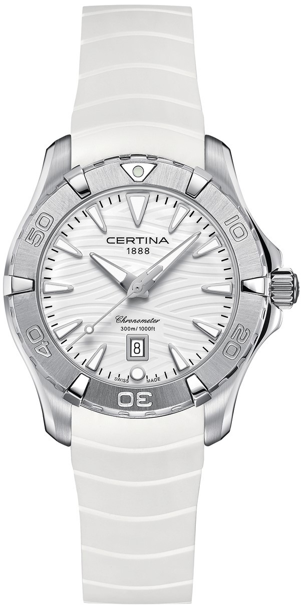 Certina DS Action Lady Chronometer C032.251.17.011.00 sú dámske batériové hodinky na gumovom remienku s preklápacou sponou. Puzdro z nerezovej ocele v kombinácii brusu a lesku má priemer 34,3 milimetra, skrutkovaciu korunku a jednosmerne otočnú lunetu s leštenými prvkami alebo satinovaním a potápačskou stupnicou. Viečko značené logom v tvare korytnačky reprezentuje robustnosť a dlhú životnosť hodiniek Certina. Biely číselník s motívom vĺn a indikáciou dáta je chránený odolným zafírovým sklom s antireflexnou vrstvou. Aplikované hodinové indexy sú spolu s ručičkami pokryté luminiscenčným náterom Super-LumiNova®, ktorý garantuje perfektnú čitateľnosť za zhoršených svetelných podmienok. Pohon hodiniek zaisťuje spoľahlivý quartzový strojček ETA F04.411 s technológiou Precidrive s presnosťou +/- 10 sekúnd za rok a indikáciou slabej batérie. Hodinky s C.O.S.C. certifikáciou, ktorá je zárukou vysokej presnosti, nesú označenie „Chronometer“. Model disponuje technológiou DS (Double Security) používanou a zdokonaľovanou už od roku 1959, vďaka ktorej majú hodinky zvýšenú odolnosť voči nárazom a vode. Vodotesnosť hodiniek robí 30 ATM a sú tak vhodnou voľbou na šnorchlovanie a hlbinné potápanie.