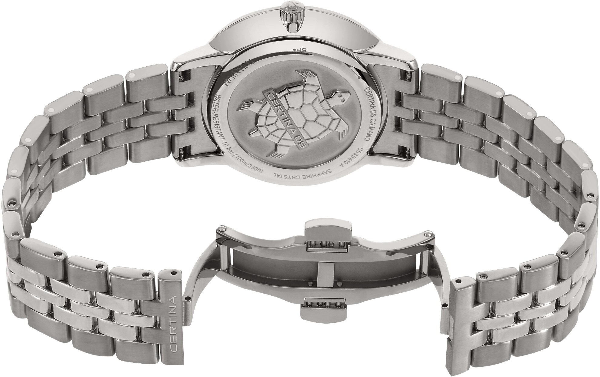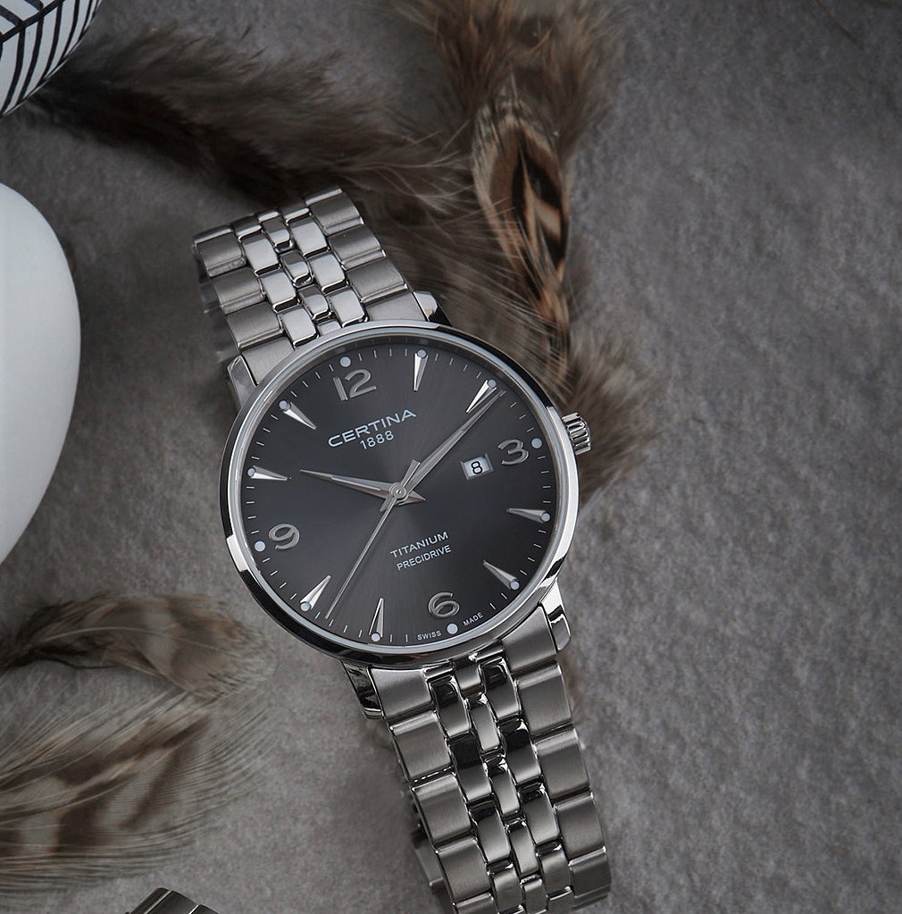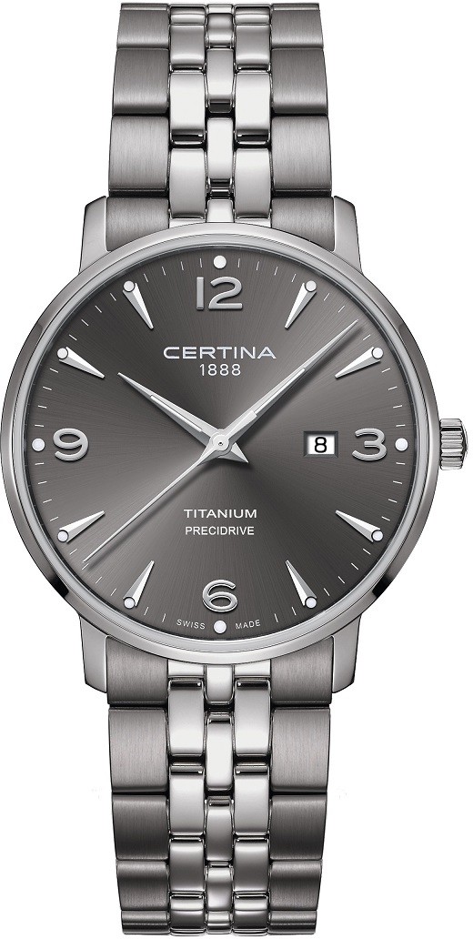 Certina DS Caimano C035.410.44.087.00 sú pánske batériové hodinky na titánovom náramku v kombinácii brusu a lesku s motýlikovou sponou. Puzdro z titánu má priemer 39 milimetrov a viečko značené logom v tvare korytnačky, ktoré reprezentuje robustnosť a dlhú životnosť hodiniek Certina. Šedý číselník s efektom slnečného brusu a indikáciou dátumu je chránený odolným zafírovým sklom s antireflexnou vrstvou. Aplikované hodinové indexy a ručičky sú pokryté luminiscenčným náterom Super-LumiNova®, ktorý garantuje perfektnú čitateľnosť za zhoršených svetelných podmienok. Pohon hodiniek zaisťuje quartzový strojček ETA F05.411 s technológiou Precidrive s presnosťou +/- 10 sekúnd za rok a indikáciou slabej batérie. Model disponuje technológiou DS (Double Security) používanou a zdokonaľovanou už od roku 1959, vďaka ktorej majú hodinky zvýšenú odolnosť voči nárazom a vode. Vodotesnosť hodiniek je 10 ATM a sú teda vhodné na kúpanie alebo šnorchlovanie.