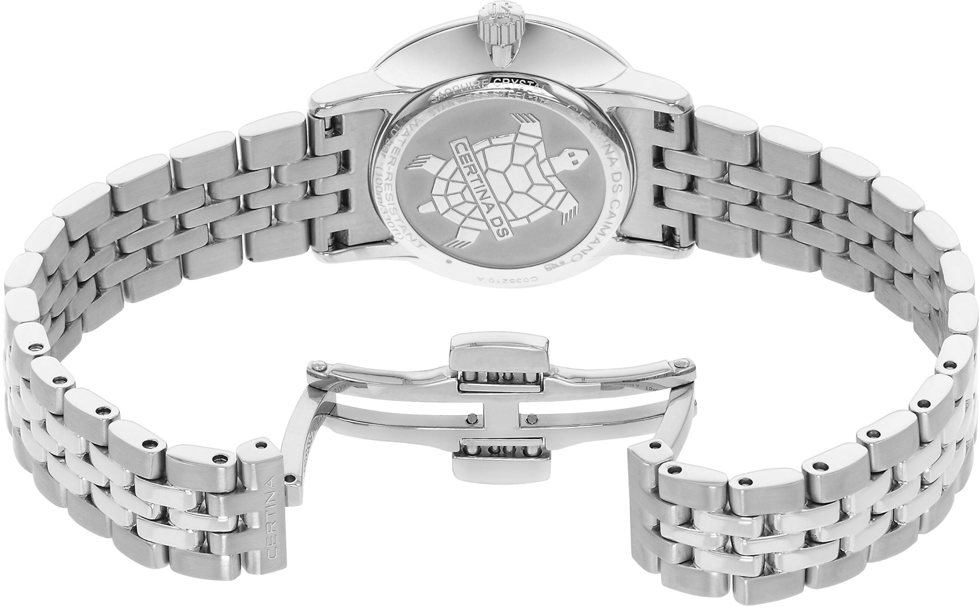 Certina DS Caimano Lady C035.210.11.037.00 sú dámske batériové hodinky na oceľovom náramku v kombinácii brusu a lesku s motýlikovou sponou. Puzdro z nerezovej ocele má priemer 28 milimetrov a viečko značené logom v tvare korytnačky, ktoré reprezentuje robustnosť a dlhú životnosť hodiniek Certina. Strieborný číselník s efektom slnečného brusu a indikáciou dátumu je chránený odolným zafírovým sklom s antireflexnou vrstvou. Aplikované hodinové indexy a ručičky sú pokryté luminiscenčným náterom Super-LumiNova®, ktorý garantuje perfektnú čitateľnosť za zhoršených svetelných podmienok. Pohon hodiniek zaisťuje quartzový strojček ETA F03.412 s technológiou Precidrive s presnosťou +/- 10 sekúnd za rok a indikáciou slabej batérie. Model disponuje technológiou DS (Double Security) používanou a zdokonaľovanou už od roku 1959, vďaka ktorej majú hodinky zvýšenú odolnosť voči nárazom a vode. Vodotesnosť hodiniek je 10 ATM a sú teda vhodné na kúpanie alebo šnorchlovanie.