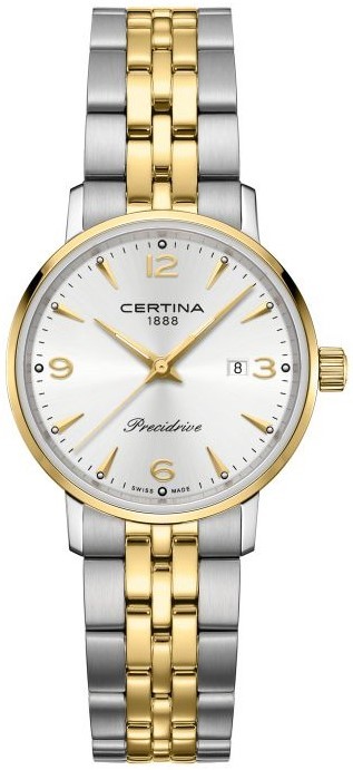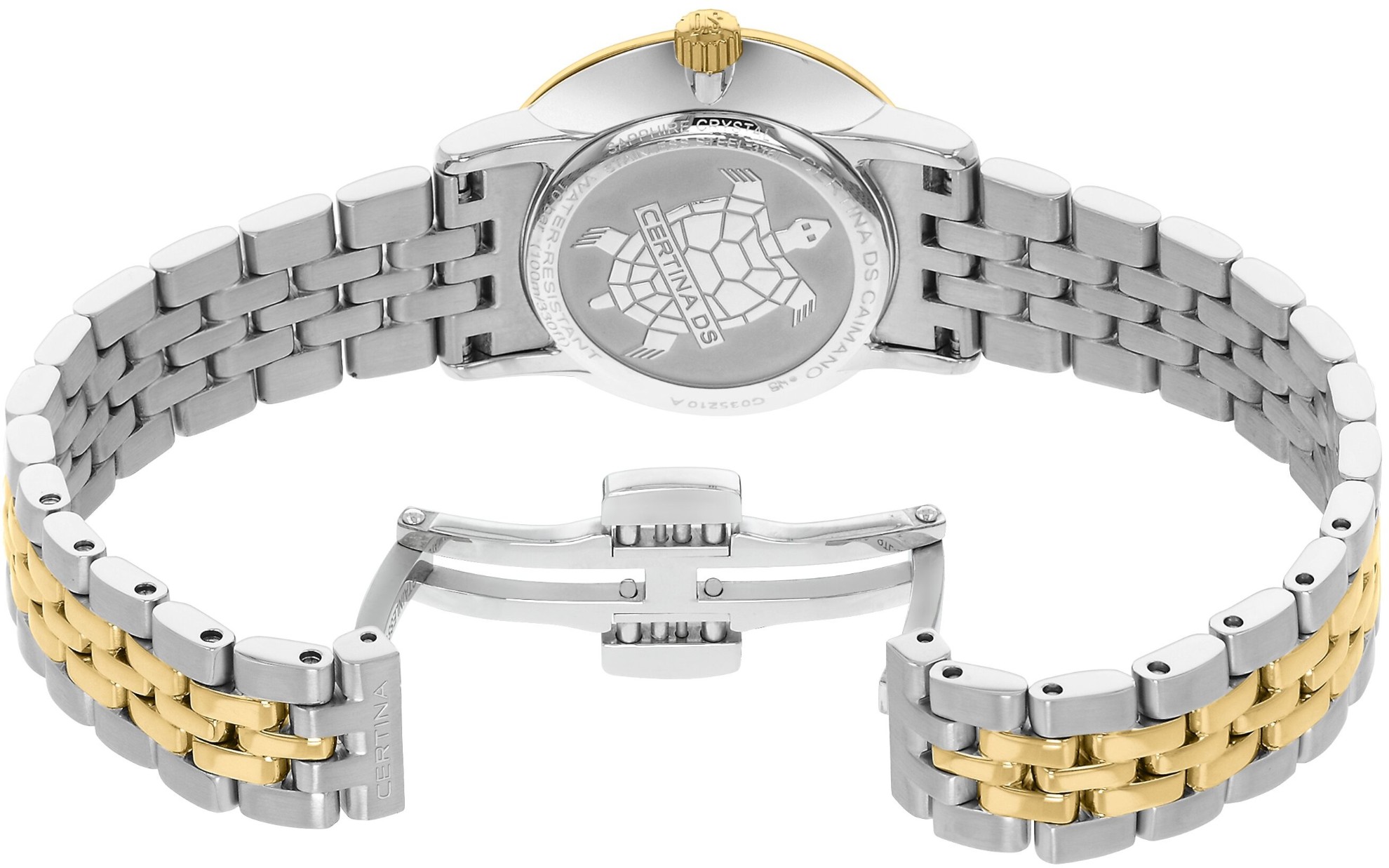 Certina DS Caimano Lady C035.210.22.037.02 sú dámske batériové hodinky na oceľovom bicolor náramku s čiastočnou PVD úpravou zlatej farby a motýlikovou sponou. Puzdro z nerezovej ocele má priemer 28 milimetrov, vonkajšiu lunetu aj korunku s PVD úpravou v zlatej farbe a viečko značené logom v tvare korytnačky, ktoré reprezentuje robustnosť a dlhú životnosť hodiniek Certina. Strieborný číselník s efektom slnečného brusu a indikáciou dátumu je chránený odolným zafírovým sklom s antireflexnou vrstvou. Aplikované hodinové indexy a ručičky sú pokryté luminiscenčným náterom Super-LumiNova®, ktorý garantuje perfektnú čitateľnosť za zhoršených svetelných podmienok. Pohon hodiniek zaisťuje quartzový strojček ETA F03.411 s technológiou Precidrive s presnosťou +/- 10 sekúnd za rok a indikáciou slabej batérie. Model disponuje technológiou DS (Double Security) používanou a zdokonaľovanou už od roku 1959, vďaka ktorej majú hodinky zvýšenú odolnosť voči nárazom a vode. Vodotesnosť hodiniek činí 10 ATM a sú teda vhodné na kúpanie alebo šnorchlovanie.