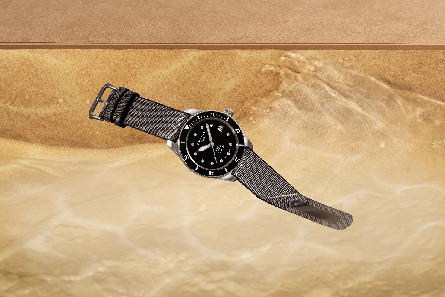 Certina DS PH100m C044.210.18.051.00 sú dámske batériové hodinky na šedom textilnom remienku s tŕňovou sponou. Puzdro z nerezovej ocele má priemer 37,5 milimetra a vonkajšiu lunetu s čiernou hliníkovou vložkou. Zadné viečko je značené logom v tvare korytnačky, ktoré reprezentuje robustnosť a dlhú životnosť hodiniek Certina. Čierny číselník s indikáciou dáta je chránený odolným zafírovým sklom s antireflexnou vrstvou. Aplikované hodinové indexy dopĺňajú výrazné ručičky opatrené luminiscenčným náterom Super-LumiNova®, ktorý garantuje perfektnú čitateľnosť za zhoršených svetelných podmienok. Pohon hodiniek zaisťuje spoľahlivý quartzový strojček ETA F06.412 s presnosťou +/- 10 sekúnd za rok a indikáciou slabej batérie. Model disponuje technológiou DS (Double Security) používanou a zdokonaľovanou už od roku 1959, vďaka ktorej majú hodinky zvýšenú odolnosť voči nárazom a vode. Vodotesnosť hodiniek robí 10 ATM a sú teda vhodnou voľbou pre šnorchlovanie a plávanie.