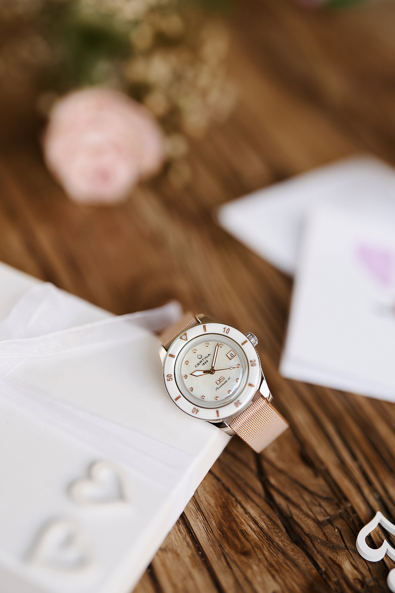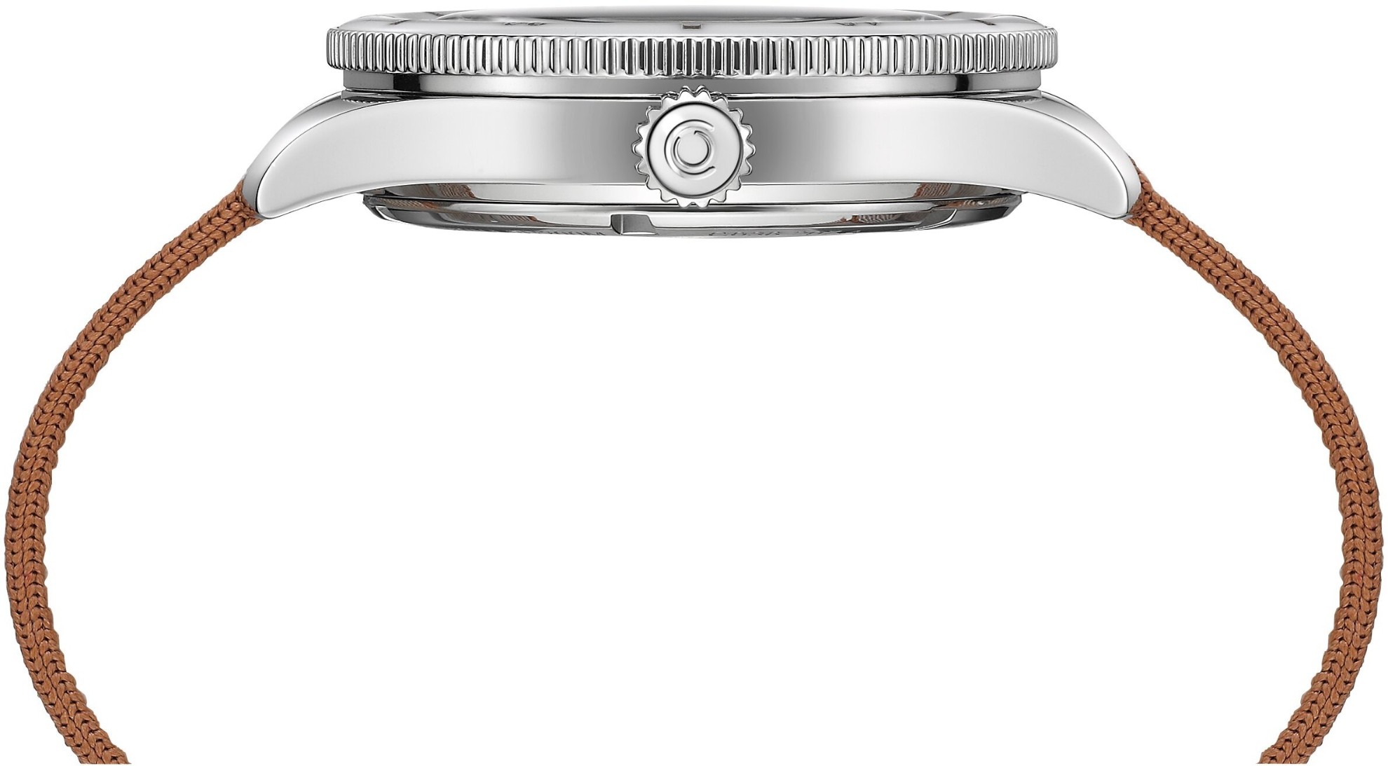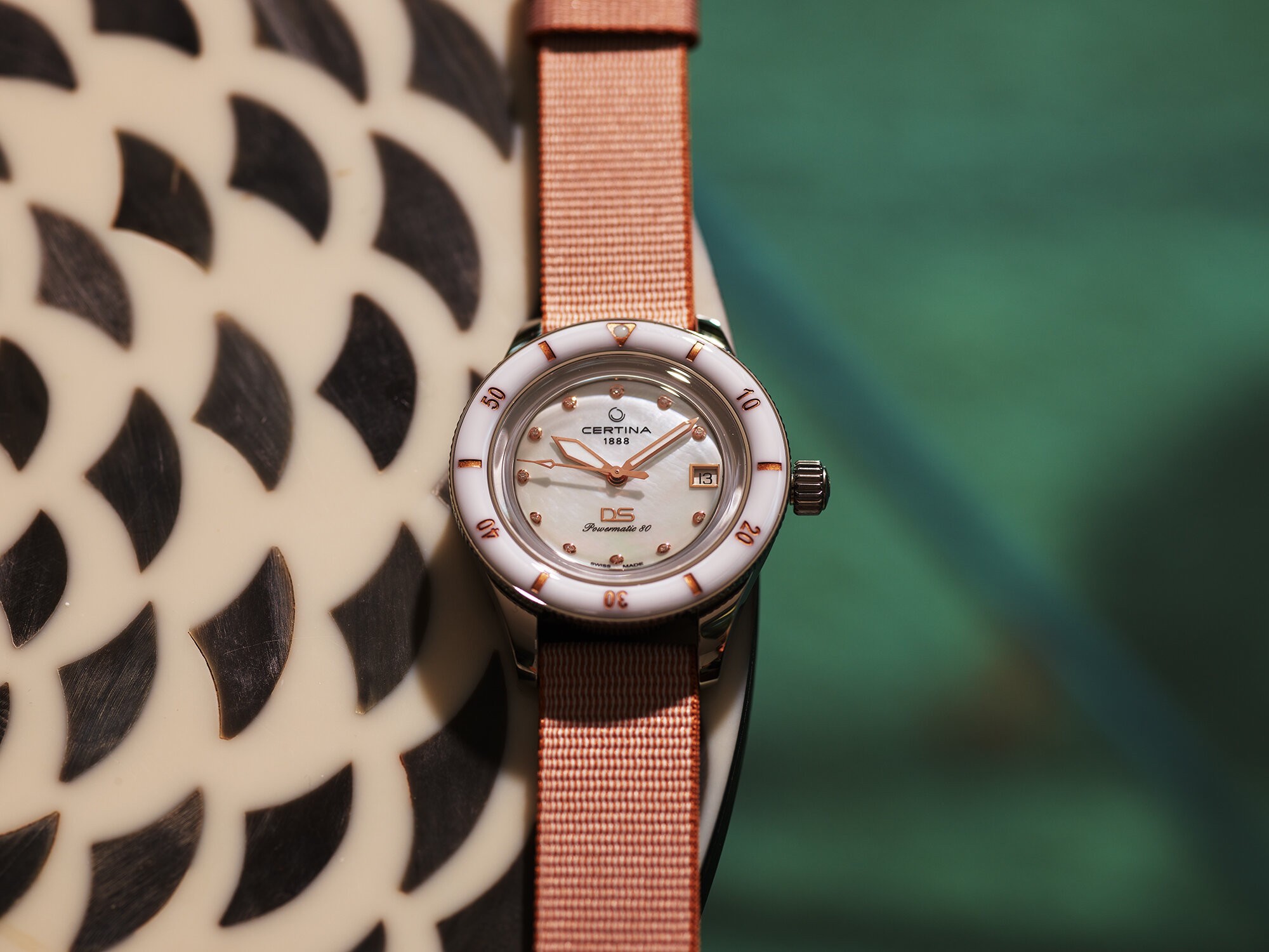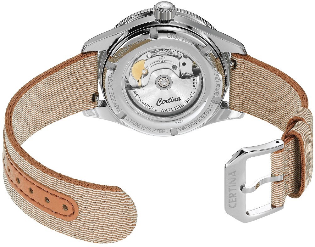 Certina DS PH200 Powermatic 80 C036.207.18.106.00 sú dámske automatické hodinky na textilnom remienku z materiálu #tide ocean, ktorý spája dobrý vzhľad s dobrou vecou: materiál je vyrobený z plastov vylovených zo svetových oceánov . Hodinky svojim dizajnom nadväzujú na dnes už kultový model PH200M z roku 1967. Puzdro z nerezovej ocele v kombinácii brusu a lesku má priemer 39 milimetrov, jednosmerne otočnú lunetu s jemne vypuklou keramickou vložkou s potápačskou stupnicou a priehľadné viečko. Perleťový číselník s indikáciou dátumu je chránený vypuklým zafírovým sklom s antireflexnou vrstvou a jeho krása vyniká najmä pod priamym svetlom, kedy môžeme pozorovať hru farieb perlete. Hodinové indexy sú tvorené 11 diamantmi a ručičky s časťou lunety sú pokryté luminiscenčným náterom Super-LumiNova®, ktorý garantuje perfektnú čitateľnosť za zhoršených svetelných podmienok. Pohon hodiniek zaisťuje mechanický strojček Powermatic 80.611 s automatickým náťahom a rezervou chodu približne 80 hodín. Kaliber je vybavený vláskom zotrvačky Nivachron™, čo je špeciálny antimagnetický materiál, vďaka ktorému sú hodinky veľmi odolné voči magnetickým poliam. Tento strojček s funkciou hackingu je možné v prípade potreby naťahovať aj ručne pomocou skrutkovacej korunky. Model disponuje technológiou DS (Double Security) používanou a zdokonaľovanou už od roku 1959, vďaka ktorej majú hodinky zvýšenú odolnosť voči nárazom a vode. Vodotesnosť hodiniek robí 20 ATM a sú tak vhodnou voľbou na šnorchlovanie a potápanie.