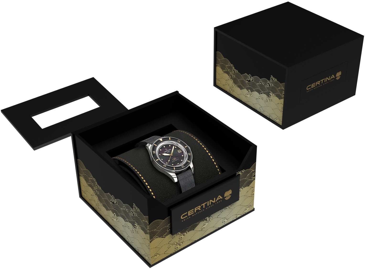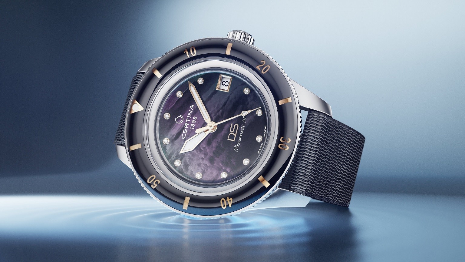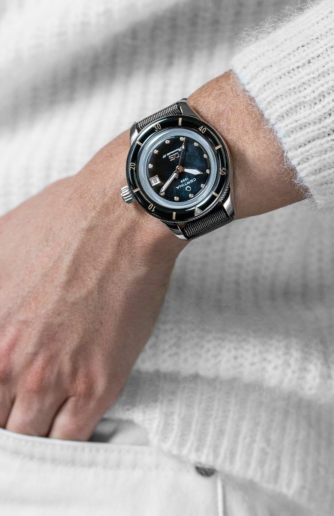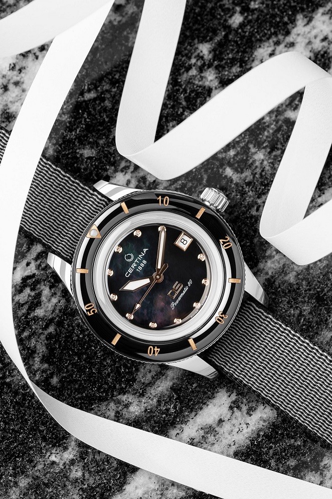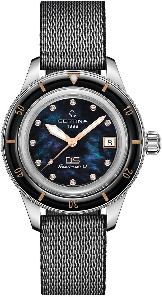 Certina DS PH200 Powermatic 80 C036.207.18.126.00 sú dámske automatické hodinky na textilnom remienku z materiálu #tide ocean, ktorý spája dobrý vzhľad s dobrou vecou: materiál je vyrobený z plastov vylovených zo svetových oceánov . Hodinky svojim dizajnom nadväzujú na dnes už kultový model PH200M z roku 1967. Puzdro z nerezovej ocele v kombinácii brusu a lesku má priemer 39 milimetrov, jednosmerne otočnú lunetu s jemne vypuklou keramickou vložkou s potápačskou stupnicou a priehľadné viečko. Modro-čierny perleťový číselník s indikáciou dátumu je chránený vypuklým zafírovým sklom s antireflexnou vrstvou a jeho krása vyniká najmä pod priamym svetlom, kedy môžeme pozorovať hru farieb perlete. Hodinové indexy sú tvorené 11 diamantmi a ručičky s časťou lunety sú pokryté luminiscenčným náterom Super-LumiNova®, ktorý garantuje perfektnú čitateľnosť za zhoršených svetelných podmienok. Pohon hodiniek zaisťuje mechanický strojček Powermatic 80.611 s automatickým náťahom a rezervou chodu približne 80 hodín. Kaliber je vybavený vláskom zotrvačky Nivachron™, čo je špeciálny antimagnetický materiál, vďaka ktorému sú hodinky veľmi odolné voči magnetickým poliam. Tento strojček s funkciou hackingu je možné v prípade potreby naťahovať aj ručne pomocou skrutkovacej korunky. Model disponuje technológiou DS (Double Security) používanou a zdokonaľovanou už od roku 1959, vďaka ktorej majú hodinky zvýšenú odolnosť voči nárazom a vode. Vodotesnosť hodiniek robí 20 ATM a sú tak vhodnou voľbou na šnorchlovanie a potápanie.