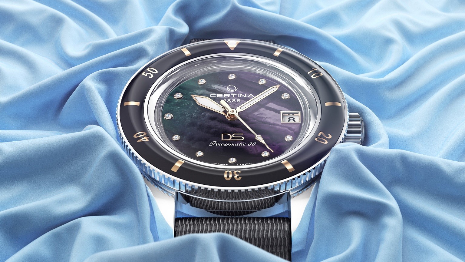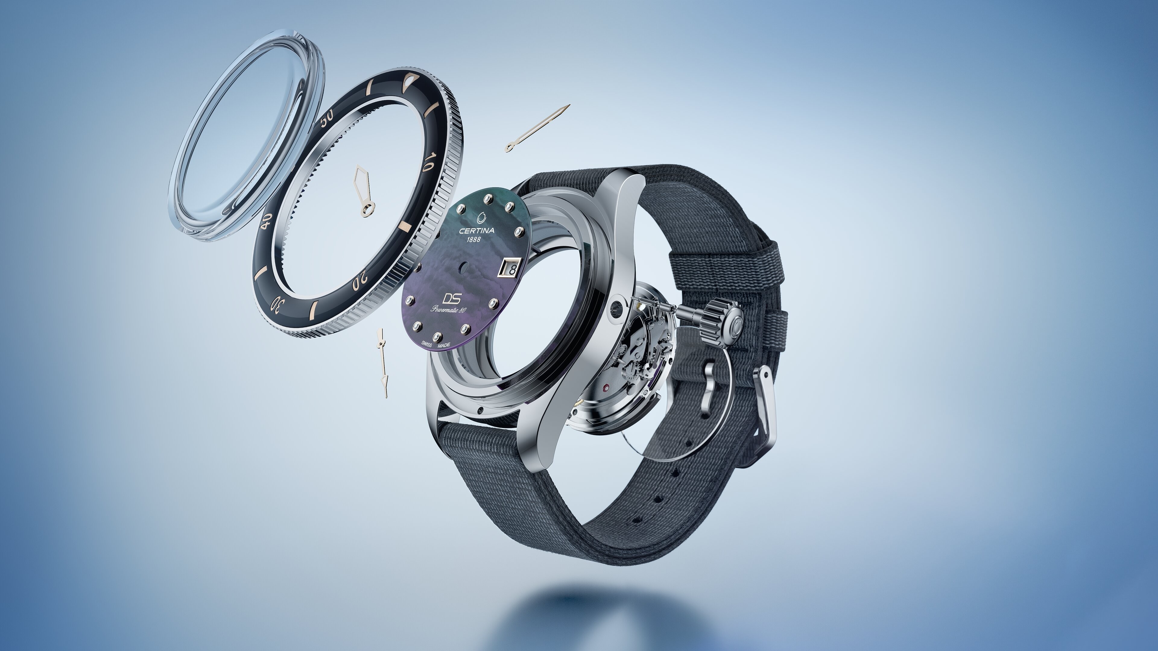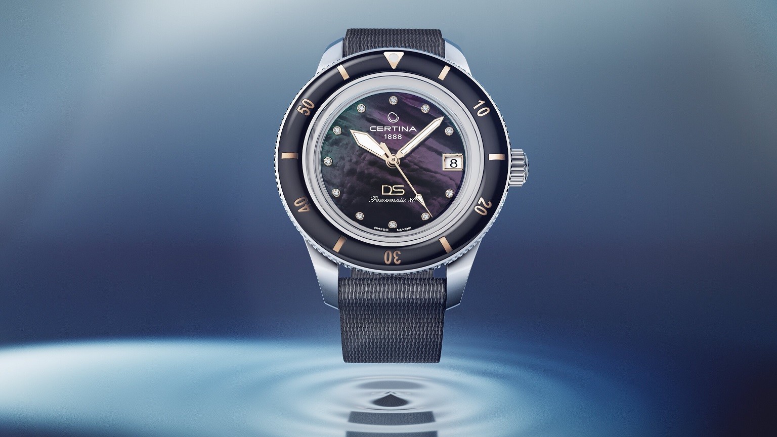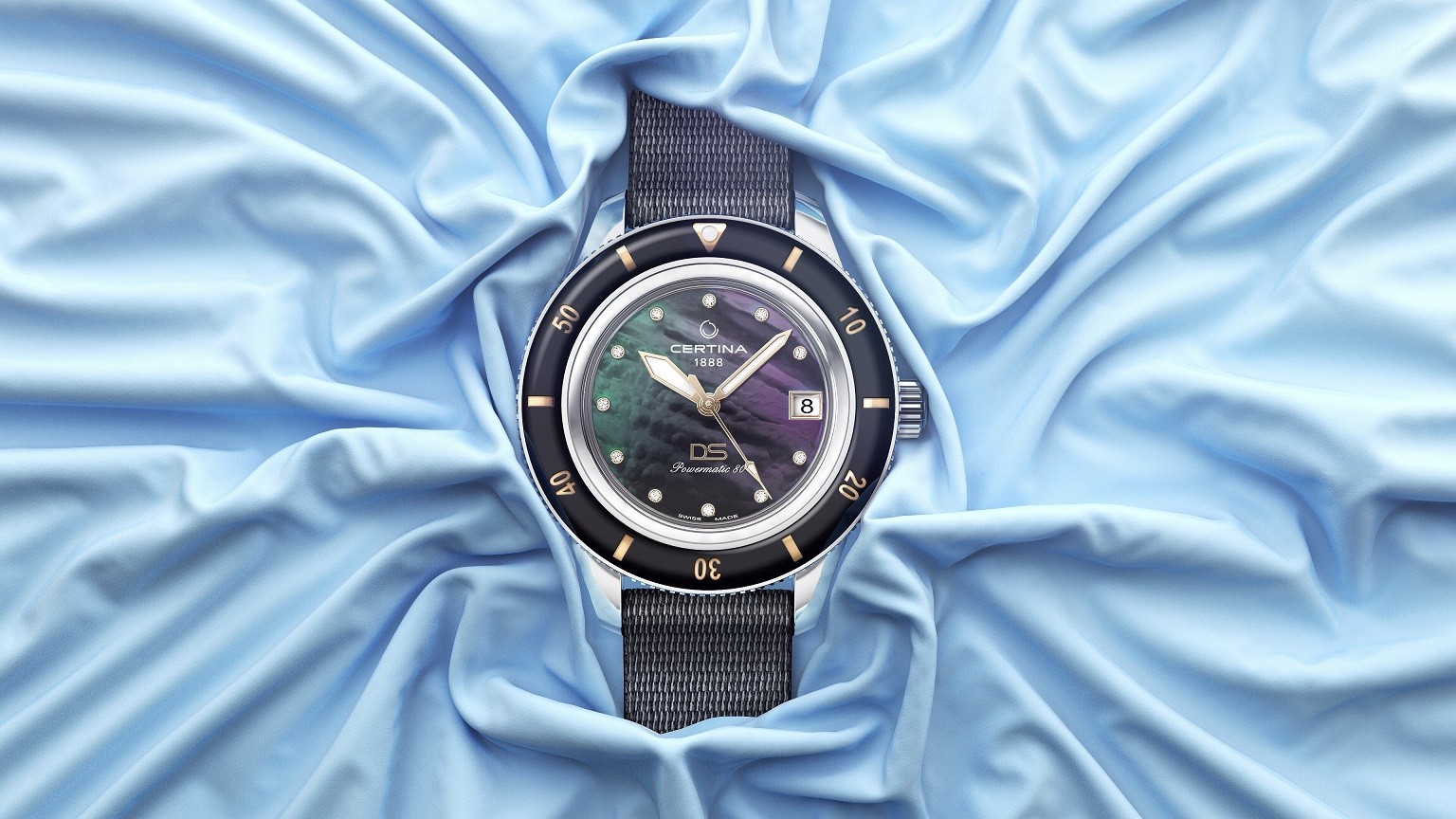 Certina DS PH200 Powermatic 80 C036.207.18.126.00 sú dámske automatické hodinky na textilnom remienku z materiálu #tide ocean, ktorý spája dobrý vzhľad s dobrou vecou: materiál je vyrobený z plastov vylovených zo svetových oceánov . Hodinky svojim dizajnom nadväzujú na dnes už kultový model PH200M z roku 1967. Puzdro z nerezovej ocele v kombinácii brusu a lesku má priemer 39 milimetrov, jednosmerne otočnú lunetu s jemne vypuklou keramickou vložkou s potápačskou stupnicou a priehľadné viečko. Modro-čierny perleťový číselník s indikáciou dátumu je chránený vypuklým zafírovým sklom s antireflexnou vrstvou a jeho krása vyniká najmä pod priamym svetlom, kedy môžeme pozorovať hru farieb perlete. Hodinové indexy sú tvorené 11 diamantmi a ručičky s časťou lunety sú pokryté luminiscenčným náterom Super-LumiNova®, ktorý garantuje perfektnú čitateľnosť za zhoršených svetelných podmienok. Pohon hodiniek zaisťuje mechanický strojček Powermatic 80.611 s automatickým náťahom a rezervou chodu približne 80 hodín. Kaliber je vybavený vláskom zotrvačky Nivachron™, čo je špeciálny antimagnetický materiál, vďaka ktorému sú hodinky veľmi odolné voči magnetickým poliam. Tento strojček s funkciou hackingu je možné v prípade potreby naťahovať aj ručne pomocou skrutkovacej korunky. Model disponuje technológiou DS (Double Security) používanou a zdokonaľovanou už od roku 1959, vďaka ktorej majú hodinky zvýšenú odolnosť voči nárazom a vode. Vodotesnosť hodiniek robí 20 ATM a sú tak vhodnou voľbou na šnorchlovanie a potápanie.