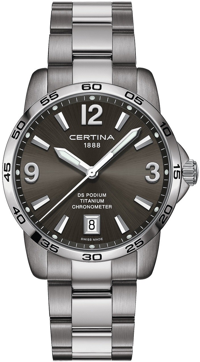 Certina DS Podium C034.451.44.087.00 sú pánske batériové hodinky na titánovom náramku v kombinácii brusu a lesku s motýlikovou sponou. Titánové puzdro s pevnou lunetou s minútovou stupnicou má priemer 40 milimetrov a viečko značené logom v tvare korytnačky, ktoré reprezentuje robustnosť a dlhú životnosť hodiniek Certina. Antracitový číselník s efektom slnečného brusu a indikáciou dátumu je chránený odolným zafírovým sklom s antireflexnou vrstvou. Aplikované hodinové indexy sú spolu s ručičkami pokryté luminiscenčným náterom Super-LumiNova®, ktorý garantuje perfektnú čitateľnosť za zhoršených svetelných podmienok. Pohon hodiniek zaisťuje quartzový strojček ETA F07.412 s technológiou Precidrive s presnosťou +/- 10 sekúnd za rok a indikáciou slabej batérie. Hodinky s C.O.S.C. certifikáciou, ktorá je zárukou vysokej presnosti, nesú označenie „Chronometer“. Model disponuje technológiou DS (Double Security) používanou a zdokonaľovanou už od roku 1959, vďaka ktorej majú hodinky zvýšenú odolnosť voči nárazom a vode. Vodotesnosť hodiniek je 10 ATM a je teda vhodná na kúpanie alebo šnorchlovanie.