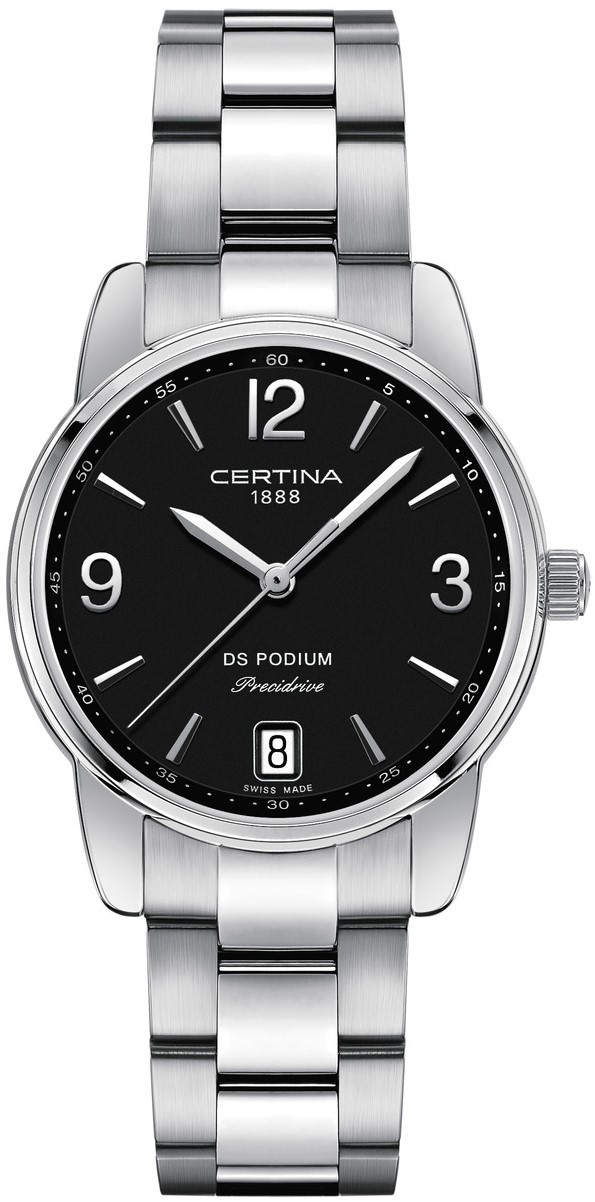 Certina DS Podium Lady C034.210.11.057.00 sú dámske batériové hodinky na kovovom náramku v kombinácii brusu a lesku s motýlikovou sponou. Puzdro z nerezovej ocele má priemer 33 milimetrov a viečko značené logom v tvare korytnačky, ktoré reprezentuje robustnosť a dlhú životnosť hodiniek Certina. Čierny číselník s indikáciou dáta je chránený odolným zafírovým sklom s antireflexnou vrstvou. Pohon hodiniek zaisťuje quartzový strojček ETA F06.411 s technológiou Precidrive s presnosťou +/- 10 sekúnd za rok a indikáciou slabej batérie. Model disponuje technológiou DS (Double Security) používanou a zdokonaľovanou už od roku 1959, vďaka ktorej majú hodinky zvýšenú odolnosť voči nárazom a vode. Vodotesnosť hodiniek je 10 ATM a je teda vhodná na kúpanie alebo šnorchlovanie.