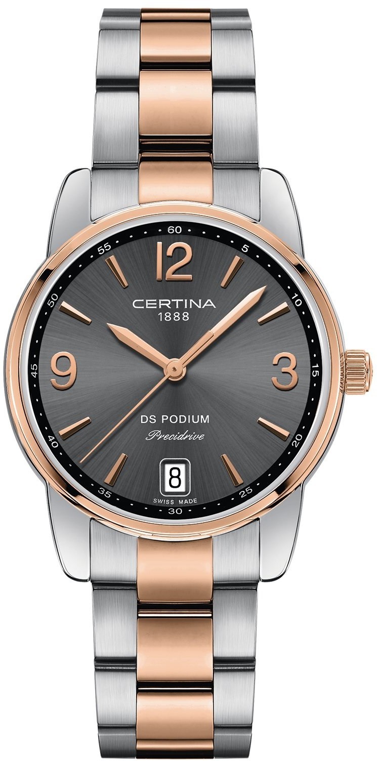 Certina DS Podium Lady C034.210.22.087.00 sú dámske batériové hodinky na oceľovom bicolor náramku s čiastočnou PVD úpravou vo farbe ružového zlata a motýlikovou sponou. Puzdro z nerezovej ocele má priemer 33 milimetrov a viečko značené logom v tvare korytnačky, ktoré reprezentuje robustnosť a dlhú životnosť hodiniek Certina. Antracitový číselník s efektom slnečného brusu a indikáciou dátumu je chránený odolným zafírovým sklom s antireflexnou vrstvou. Aplikované hodinové indexy a ručičky vyvedené vo farbe ružového zlata ladia s lunetou, korunkou a ťahom hodiniek. Pohon hodiniek zaisťuje quartzový strojček ETA F06.411 s technológiou Precidrive s presnosťou +/- 10 sekúnd za rok a indikáciou slabej batérie. Model disponuje technológiou DS (Double Security) používanou a zdokonaľovanou už od roku 1959, vďaka ktorej majú hodinky zvýšenú odolnosť voči nárazom a vode. Vodotesnosť hodiniek je 10 ATM a sú teda vhodné na kúpanie alebo šnorchlovanie.