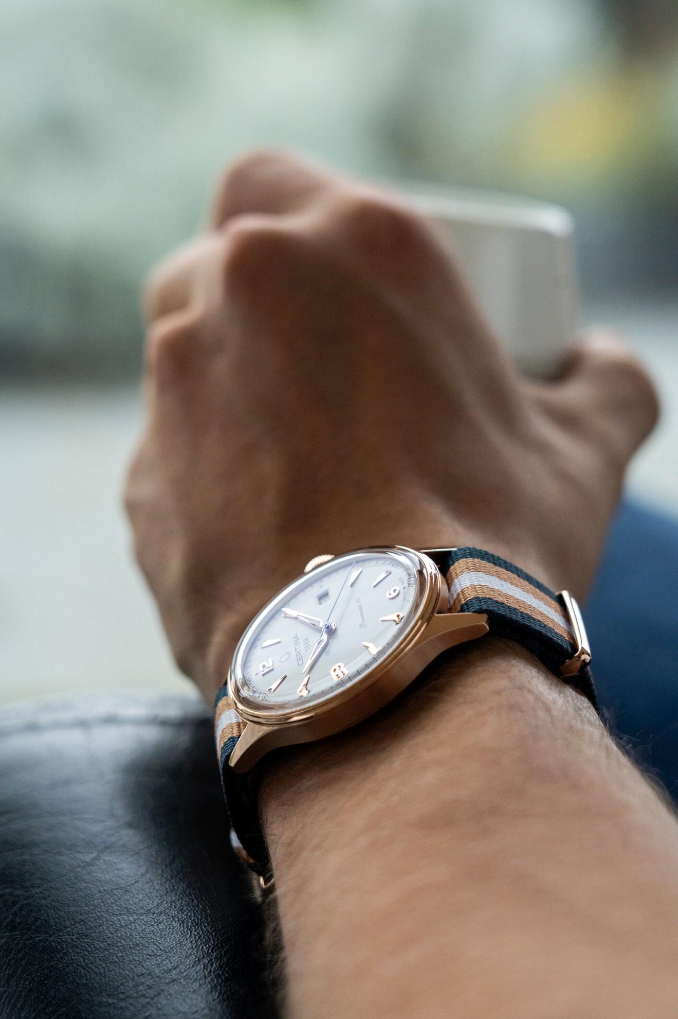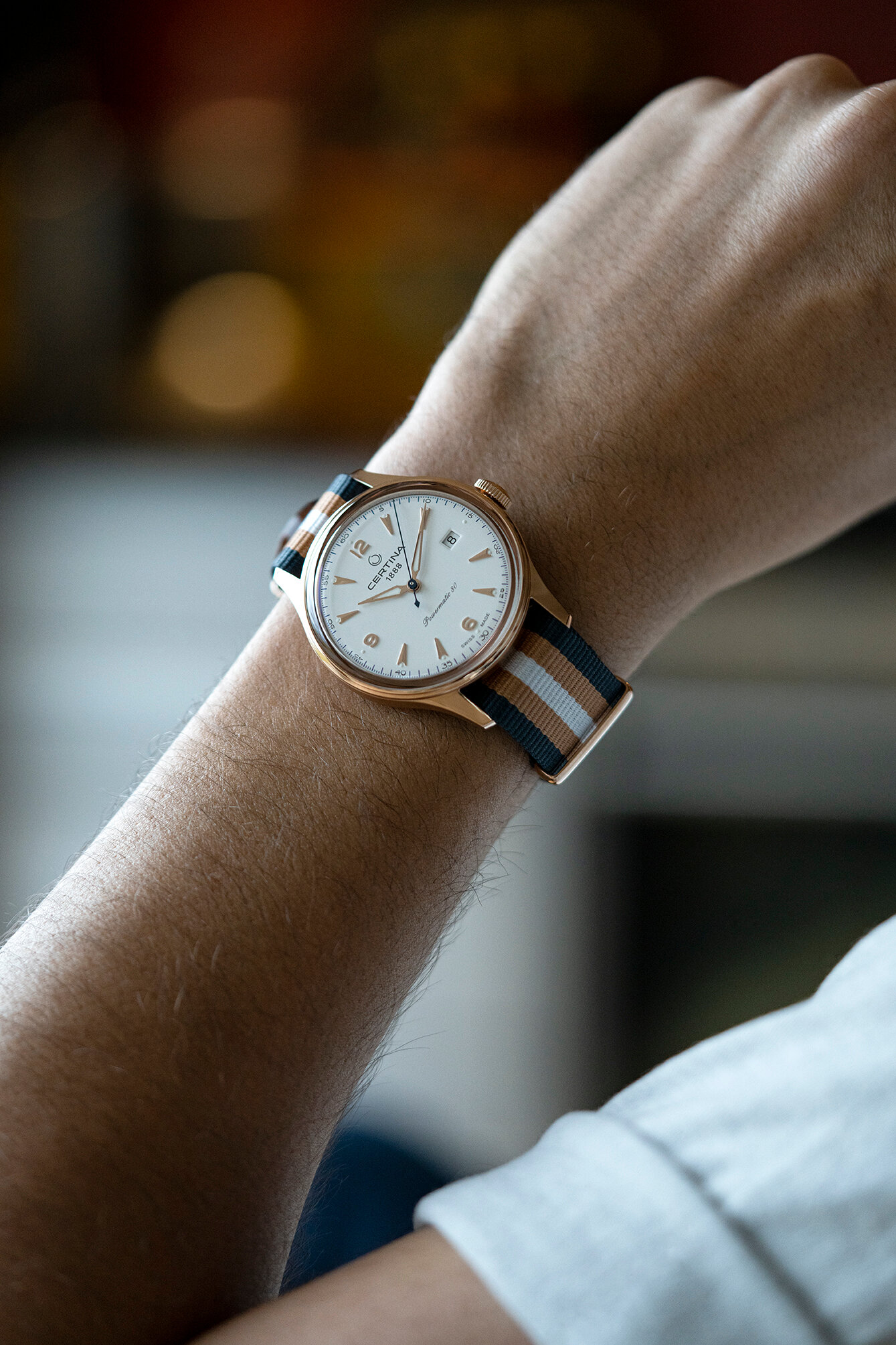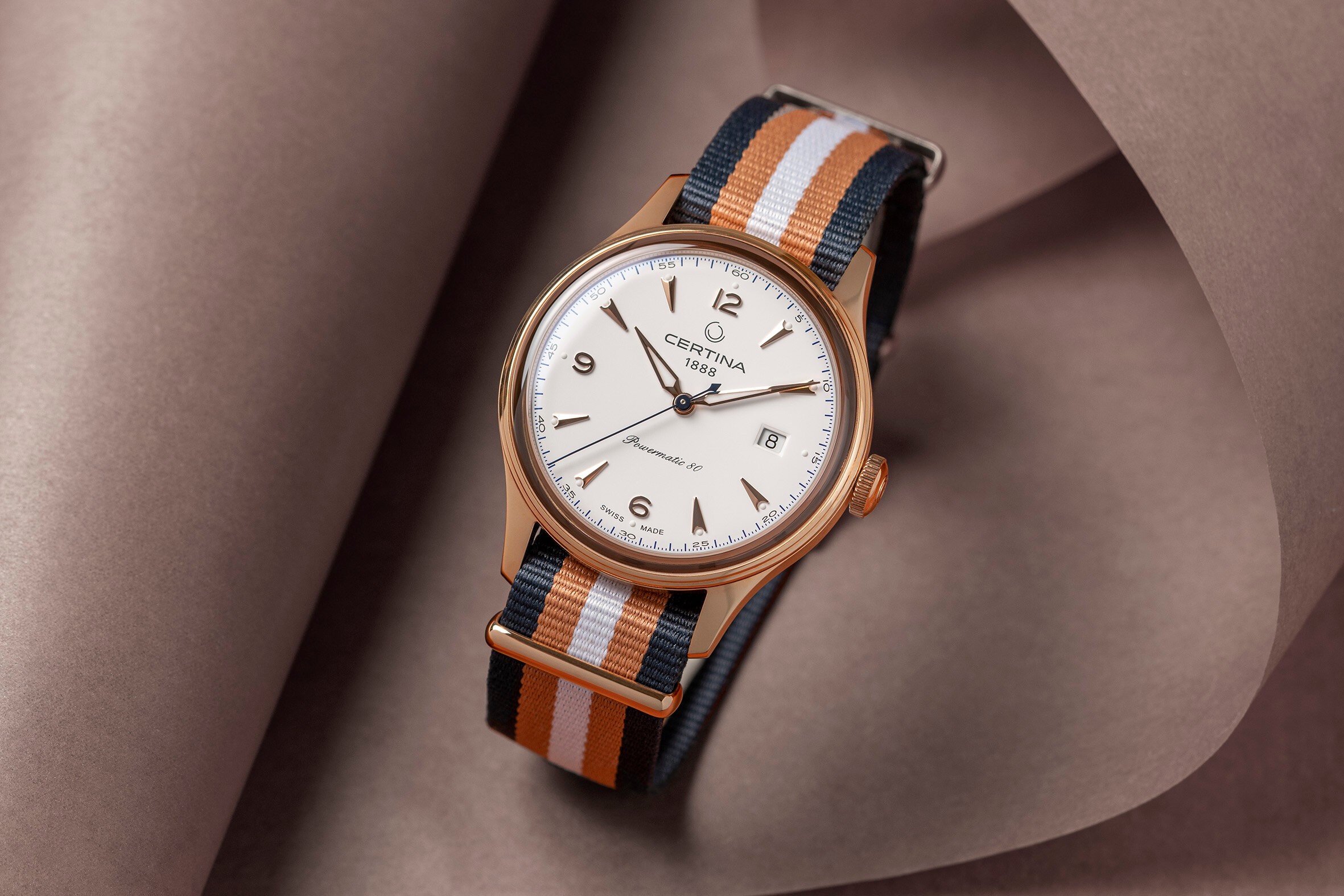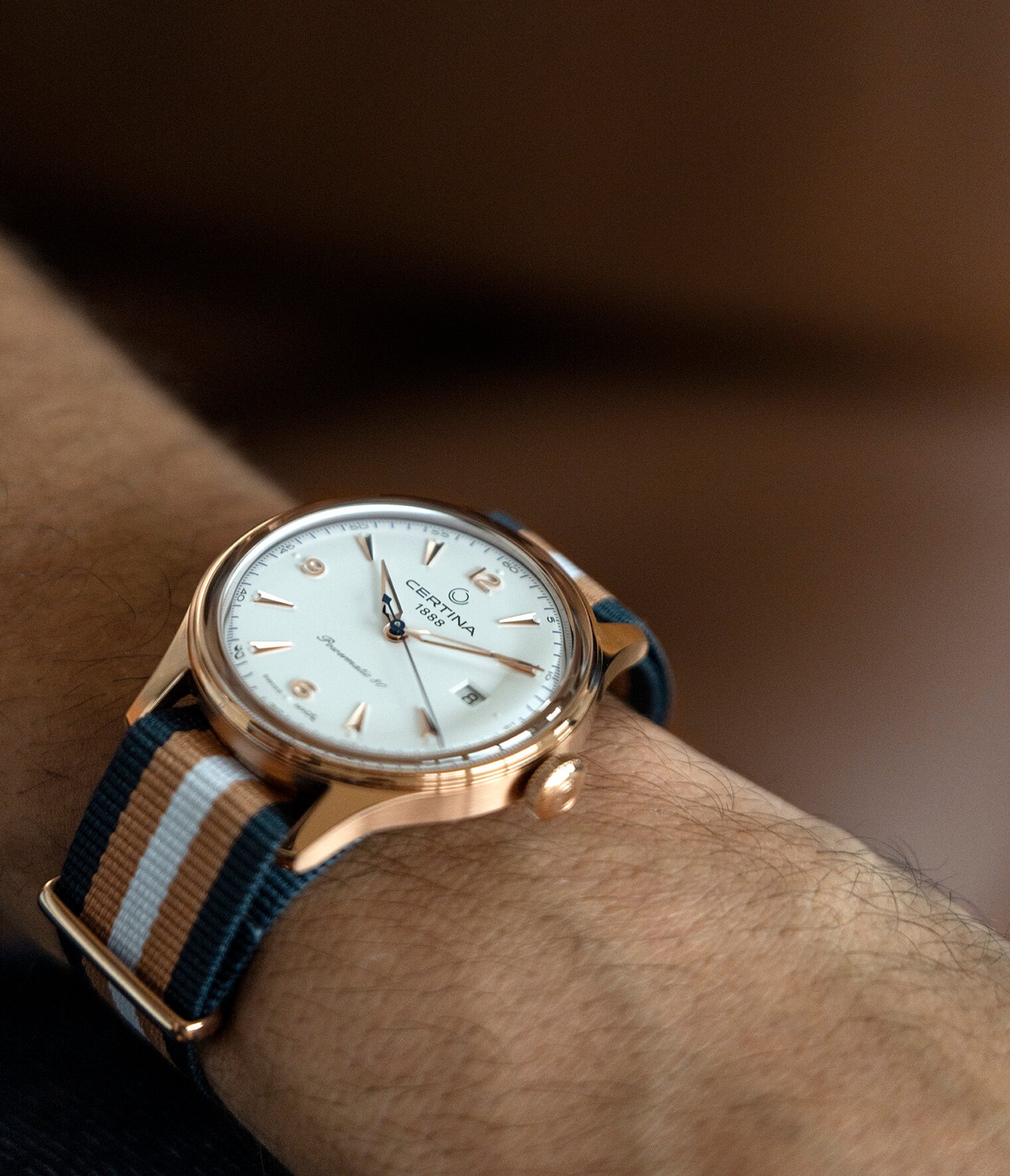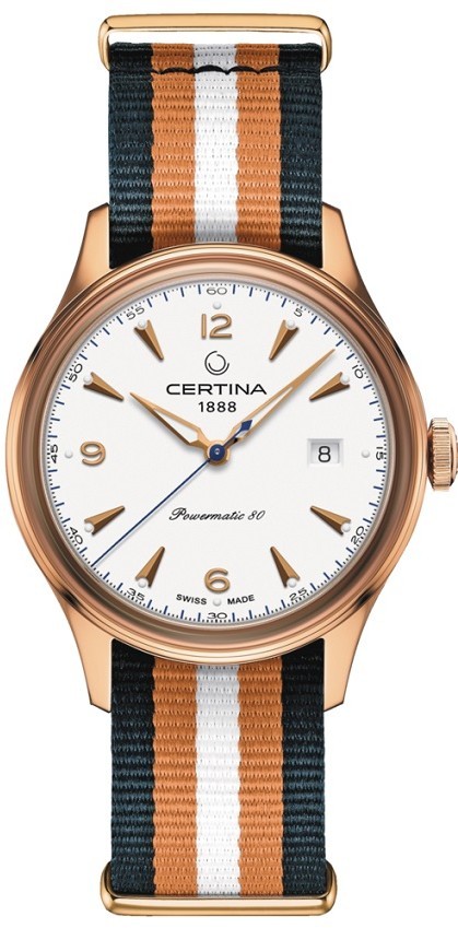 Certina DS Powermatic 80 C038.407.38.037.00 sú pánske automatické hodinky na pruhovanom NATO remienku s tŕňovou sponou. Puzdro z nerezovej ocele s PVD úpravou vo farbe ružového zlata má priemer 41 milimetrov a priehľadné viečko. Biely číselník s indikáciou dátumu je chránený vypuklým zafírovým sklom s antireflexnou vrstvou. Aplikované hodinové indexy sú spolu s ručičkami pokryté luminiscenčným náterom Super-LumiNova®, ktorý garantuje perfektnú čitateľnosť za zhoršených svetelných podmienok. Pohon hodiniek zaisťuje mechanický strojček Powermatic 80.611 s automatickým náťahom a rezervou chodu približne 80 hodín. Kaliber je vybavený vláskom zotrvačky Nivachron™, čo je špeciálny antimagnetický materiál, vďaka ktorému sú hodinky veľmi odolné voči magnetickým poliam. Tento strojček s funkciou hackingu je možné v prípade potreby naťahovať aj ručne pomocou signovanej korunky. Model disponuje technológiou DS (Double Security) používanou a zdokonaľovanou už od roku 1959, vďaka ktorej majú hodinky zvýšenú odolnosť voči nárazom a vode. Vodotesnosť hodiniek je 10 ATM a je teda vhodná na kúpanie alebo šnorchlovanie.