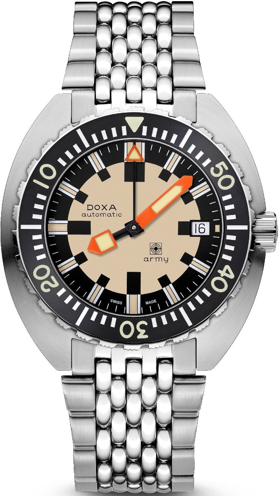 Doxa Army 785.10.031.10 sú pánske automatické hodinky v klasickom štýle na oceľovom „beads of rice“ náramku s preklápacou sponou, ktorý svoj názov získal preto, že jeho stredové dieliky pripomínajú zrnká ryže. Puzdro z nerezovej ocele má priemer 42,5 milimetra, skrutkovaciu korunku a jednosmerne otočnú lunetu s čiernou keramickou vložkou. Béžový číselník s ukazovateľom dátumu na tretej hodine je chránený odolným zafírovým sklom. Oranžové ručičky pokrýva luminiscenčný náter SuperLuminova®, ktorý po nasvietení garantuje perfektnú čitateľnosť za zhoršených svetelných podmienok. Pohon hodiniek zaisťuje mechanický strojček s automatickým náťahom a rezervou chodu 38 hodín. S vodotesnosťou 30 ATM sú hodinky vhodné na prístrojové potápanie. Súčasťou balenia je náhradný NATO remienok s maskáčovým vzorom.