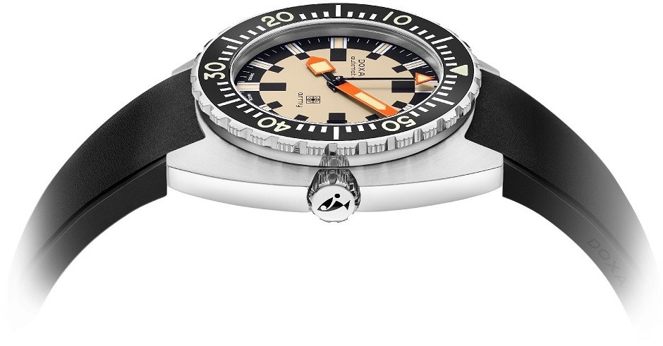 Doxa Army 785.10.031.20 sú pánske športové automatické hodinky na čiernom kaučukovom remienku s preklápacou sponou. Puzdro z nerezovej ocele má priemer 42,5 milimetra, skrutkovaciu korunku a jednosmerne otočnú lunetu s čiernou keramickou vložkou. Béžový číselník s ukazovateľom dátumu na tretej hodine je chránený odolným zafírovým sklom. Oranžové ručičky pokrýva luminiscenčný náter SuperLuminova®, ktorý po nasvietení garantuje perfektnú čitateľnosť za zhoršených svetelných podmienok. Pohon hodiniek zaisťuje mechanický strojček s automatickým náťahom a rezervou chodu 38 hodín. S vodotesnosťou 30 ATM sú hodinky vhodné na prístrojové potápanie. Súčasťou balenia je náhradný NATO remienok s maskáčovým vzorom.