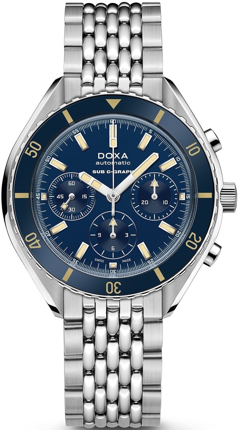 Doxa SUB 200 C-Graph Caribbean 798.10.201.10 sú pánske automatické hodinky na oceľovom „beads of rice" náramku s preklápacou sponou, ktorý svoj názov získal preto, že jeho stredové dieliky pripomínajú zrnká ryže. Puzdro z nehrdzavejúcej ocele má priemer 45 milimetrov, skrutkovaciu korunku a jednosmerne otočnú lunetu s modrou zafírovou vložkou s minútovou stupnicou. Modrý číselník so stopkami je chránený odolným zafírovým sklom s antireflexnou vrstvou. Ručičky a indexy pokrýva luminiscenčný náter SuperLuminova®, ktorý po nasvietení garantuje dokonalú čitateľnosť za zhoršených svetelných podmienok. Pohon hodín zabezpečuje švajčiarsky mechanický strojček s automatickým náťahom a rezervou chodu 56 hodín. S vodotesnosťou 20 ATM sú hodinky vhodné pre hlbinné potápanie.