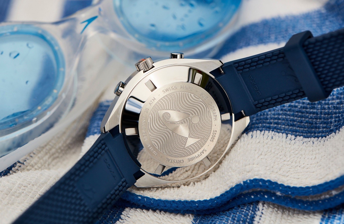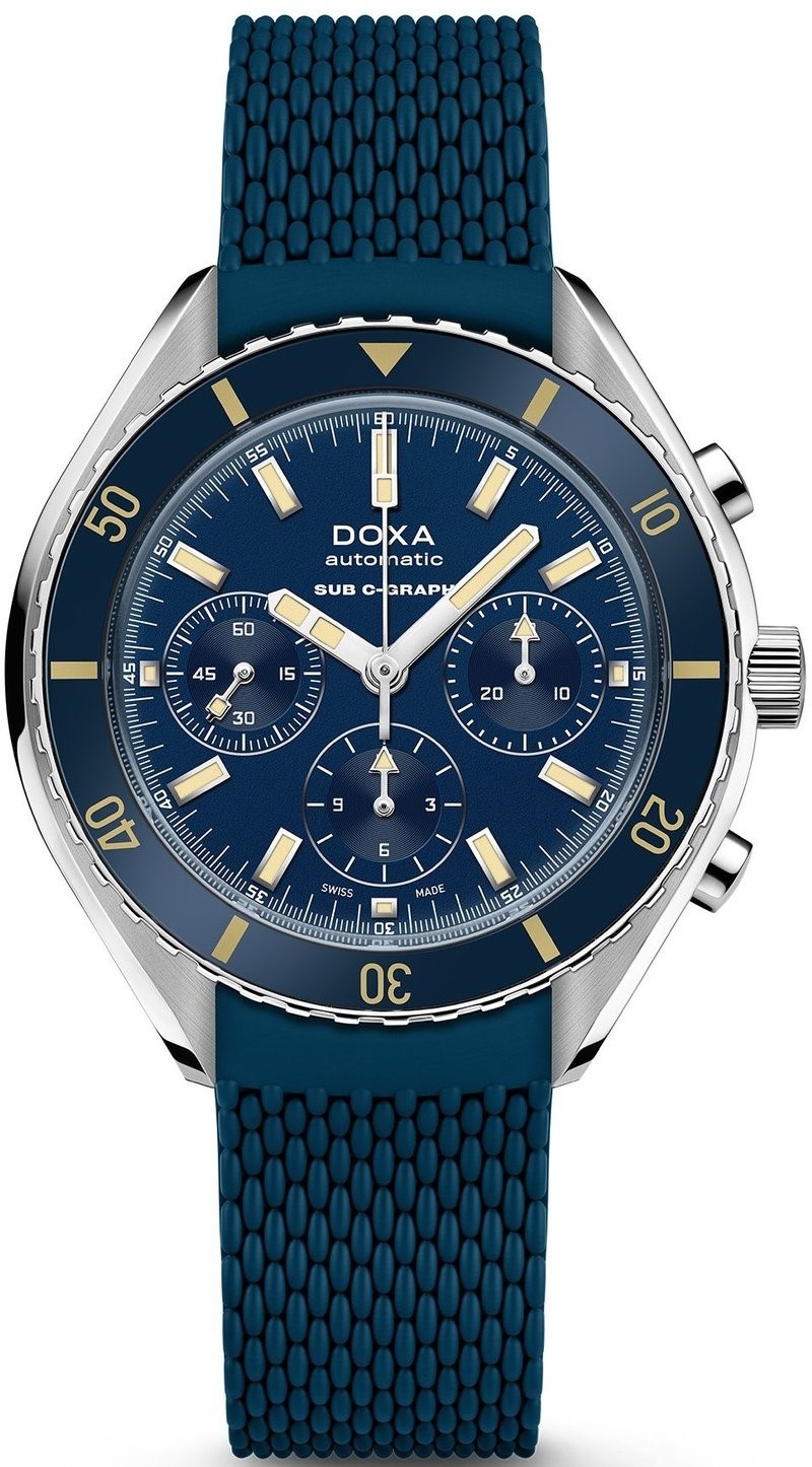Doxa SUB 200 C-Graph Caribbean 798.10.201.32 sú pánske športové automatické hodinky na modrom kaučukovom remienku s tŕňovou sponou. Puzdro z nehrdzavejúcej ocele má priemer 45 milimetrov, skrutkovaciu korunku a jednosmerne otočnú lunetu s modrou zafírovou vložkou s minútovou stupnicou. Modrý číselník so stopkami je chránený odolným zafírovým sklom s antireflexnou vrstvou. Ručičky a indexy pokrýva luminiscenčný náter SuperLuminova®, ktorý po nasvietení garantuje dokonalú čitateľnosť za zhoršených svetelných podmienok. Pohon hodín zabezpečuje švajčiarsky mechanický strojček s automatickým náťahom a rezervou chodu 56 hodín. S vodotesnosťou 20 ATM sú hodinky vhodné na hlbinné potápanie.