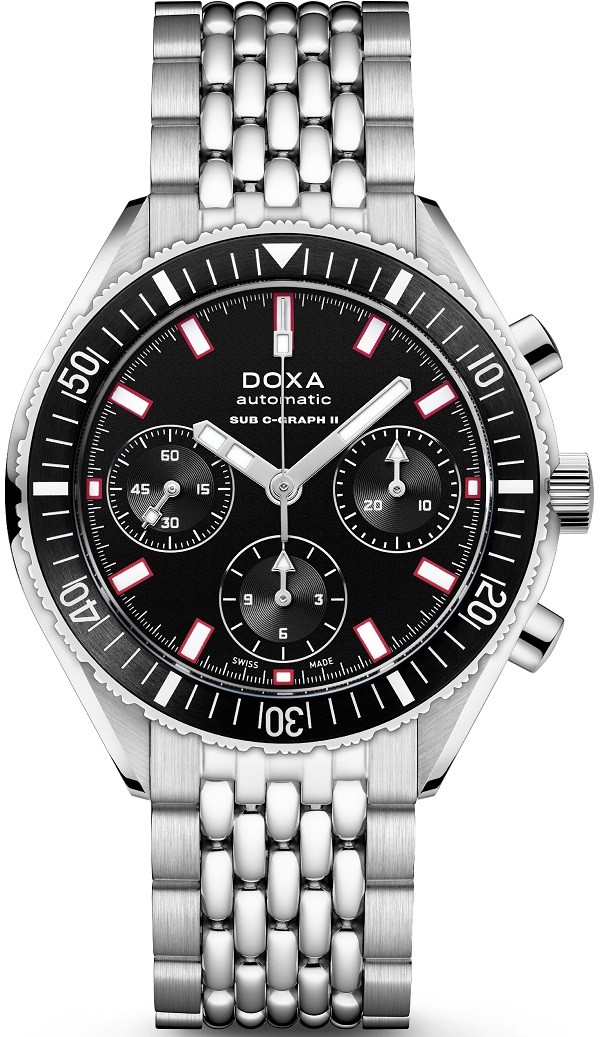 Doxa SUB 200 C-Graph II Sharkhunter 797.10.101.10 sú pánske automatické hodinky na oceľovom „beads of rice" náramku s preklápacou sponou, ktorý svoj názov získal preto, že jeho stredové dieliky pripomínajú zrnká ryže. Puzdro z nehrdzavejúcej ocele má priemer 42 milimetrov, skrutkovaciu korunku a jednosmerne otočnú lunetu s čiernou keramickou vložkou s minútovou stupnicou. Čierny číselník so stopkami je chránený odolným zafírovým sklom s antireflexnou vrstvou. Ručičky, indexy aj lunetu pokrýva luminiscenčný náter SuperLuminova®, ktorý po nasvietení garantuje dokonalú čitateľnosť za zhoršených svetelných podmienok. Pohon hodín zabezpečuje mechanický strojček s automatickým náťahom a rezervou chodu 56 hodín. S vodotesnosťou 20 ATM sú hodinky vhodné na hlbinné potápanie.