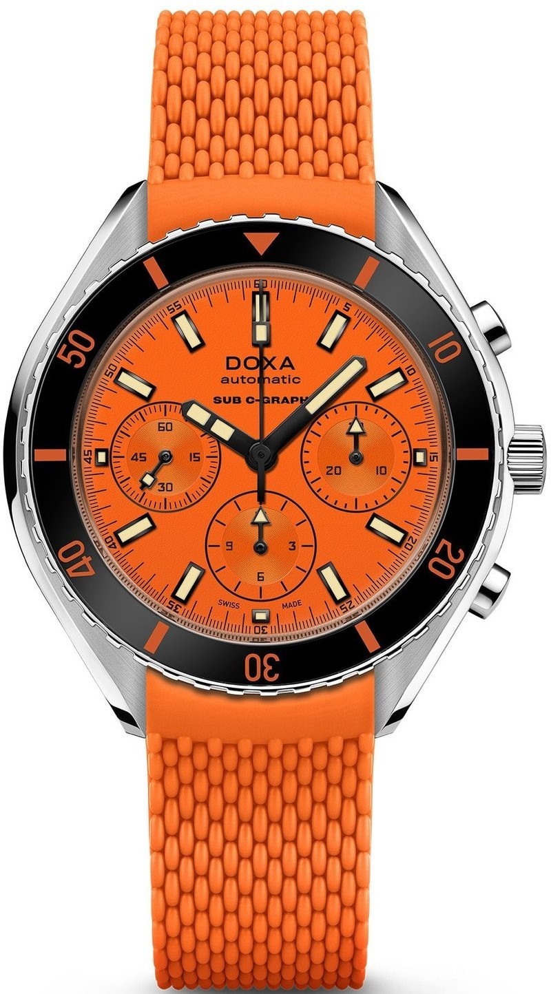Doxa SUB 200 C-Graph Professional 798.10.351.21 sú pánske športové automatické hodinky na oranžovom kaučukovom remienku s tŕňovou sponou. Puzdro z nehrdzavejúcej ocele má priemer 45 milimetrov, skrutkovaciu korunku a jednosmerne otočnú lunetu s čiernou zafírovou vložkou s minútovou stupnicou. Oranžový číselník so stopkami je chránený odolným zafírovým sklom s antireflexnou vrstvou. Ručičky a indexy pokrýva luminiscenčný náter SuperLuminova®, ktorý po nasvietení garantuje dokonalú čitateľnosť za zhoršených svetelných podmienok. Pohon hodín zabezpečuje švajčiarsky mechanický strojček s automatickým náťahom a rezervou chodu 56 hodín. S vodotesnosťou 20 ATM sú hodinky vhodné na hlbokomorské potápanie.