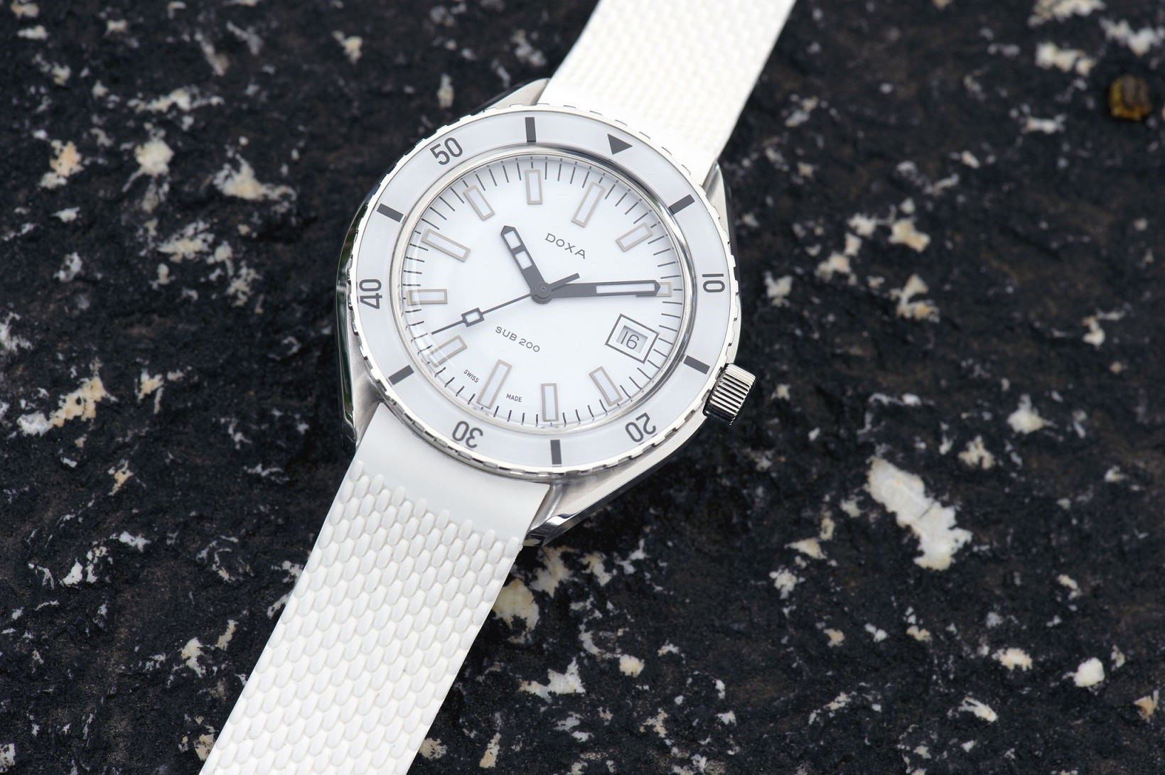 Doxa SUB 200 Whitepearl 799.10.011.23 sú pánske automatické hodinky na bielom kaučukovom remienku s tŕňovým zapínaním. Puzdro z nehrdzavejúcej ocele má priemer 42 milimetrov, skrutkovaciu korunku a jednosmerne otočnú lunetu s bielou zafírovou vložkou s minútovou stupnicou. Biely číselník s ukazovateľom dátumu na tretej hodine je chránený odolným zafírovým sklom s antireflexnou vrstvou. Ručičky, indexy aj lunetu pokrýva luminiscenčný náter SuperLuminova®, ktorý po nasvietení garantuje dokonalú čitateľnosť za zhoršených svetelných podmienok. Pohon hodín zabezpečuje mechanický strojček s automatickým náťahom a rezervou chodu 38 hodín. S vodotesnosťou 20 ATM sú hodinky vhodné na hlbinné potápanie. Hodinky sú dodávané s kaučukovým remienkom o dĺžke 125 x 75 milimetrov, na objednávku sú dostupné aj s kratším remienkom o dĺžke 110 x 65 milimetrov.