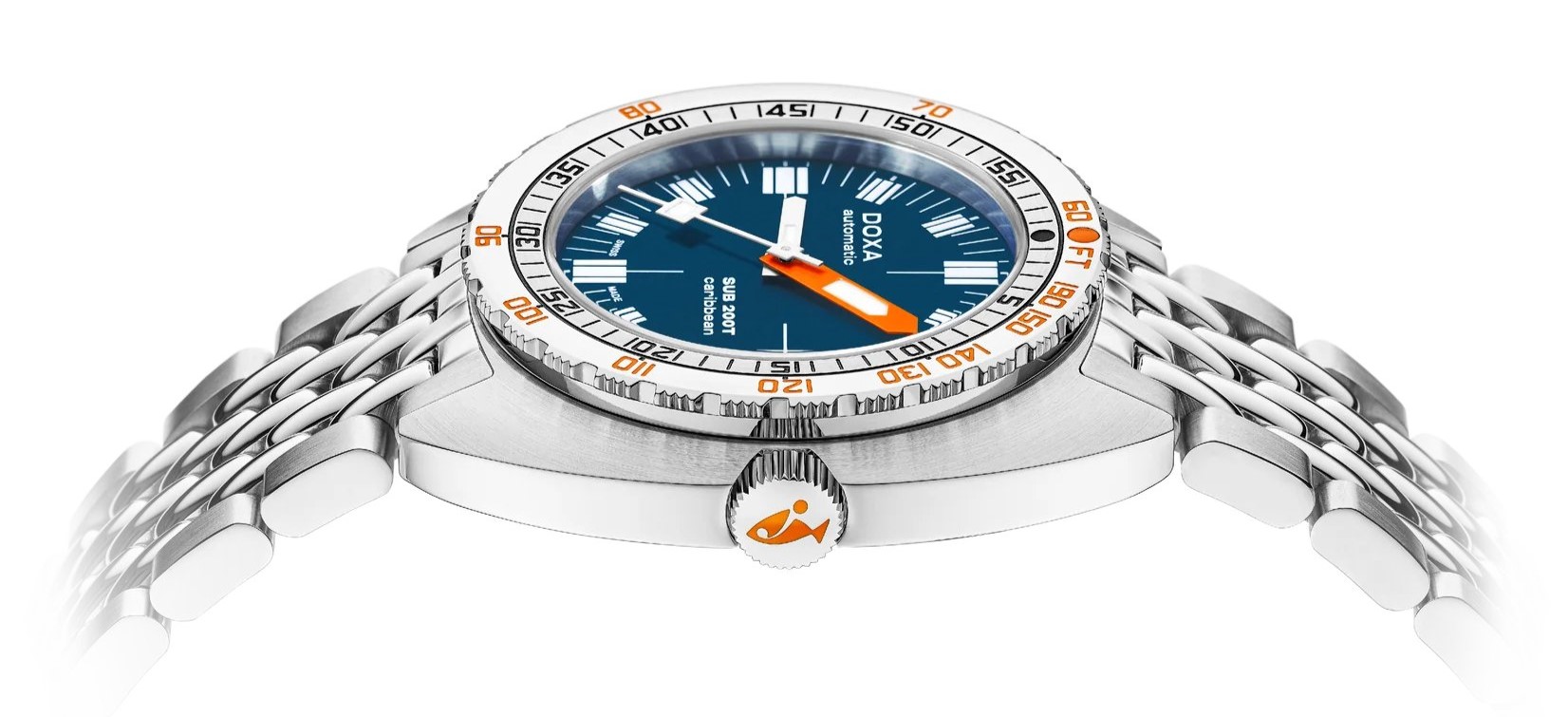 Doxa SUB 200T je model uvedený v roku 2024, avšak zároveň ide o hodinky, ktoré ťažia z celej novodobej histórie značky. Ide totiž o modernú a zmenšenú interpretáciu legendárneho modelu SUB 300, ktorý taktiež Doxa stále ponúka. Charakteristické puzdro vankúšikového tvaru tu dostalo priemer 39 milimetrov a môže sa pochváliť hrúbkou iba 10,7 milimetra. Doxa SUB 200T sú tak plnohodnotné potápačské hodinky vhodné aj pre užívateľov s menším zápästím. Dizajn hodiniek využíva všetky typické prvky legendárneho potápačského modelu 300. K siedmim výrazným farbám číselníkov, ktoré sú vôbec po prvýkrát dostupné nielen v matnom, ale aj v prevedení so sunburst efektom, pridáva Doxa aj ôsmu farbu - zelenú s názvom Sea Emerald. Model SUB 200T má aj typickú lunetu so zobrazením možnej hĺbky a času na potápanie bez dekompresie a výrazné rúčky pre maximálnu čitateľnosť pod hladinou. Samozrejmosťou je aj špičkové mechanické spracovanie a odolnosť voči vode do hĺbky 200 metrov. Okrem pre značku typického beads-of-rice oceľového náramku je možné modely 200T zaobstarať aj na gumovom remienku, ktorého farba ladí s číselníkom.