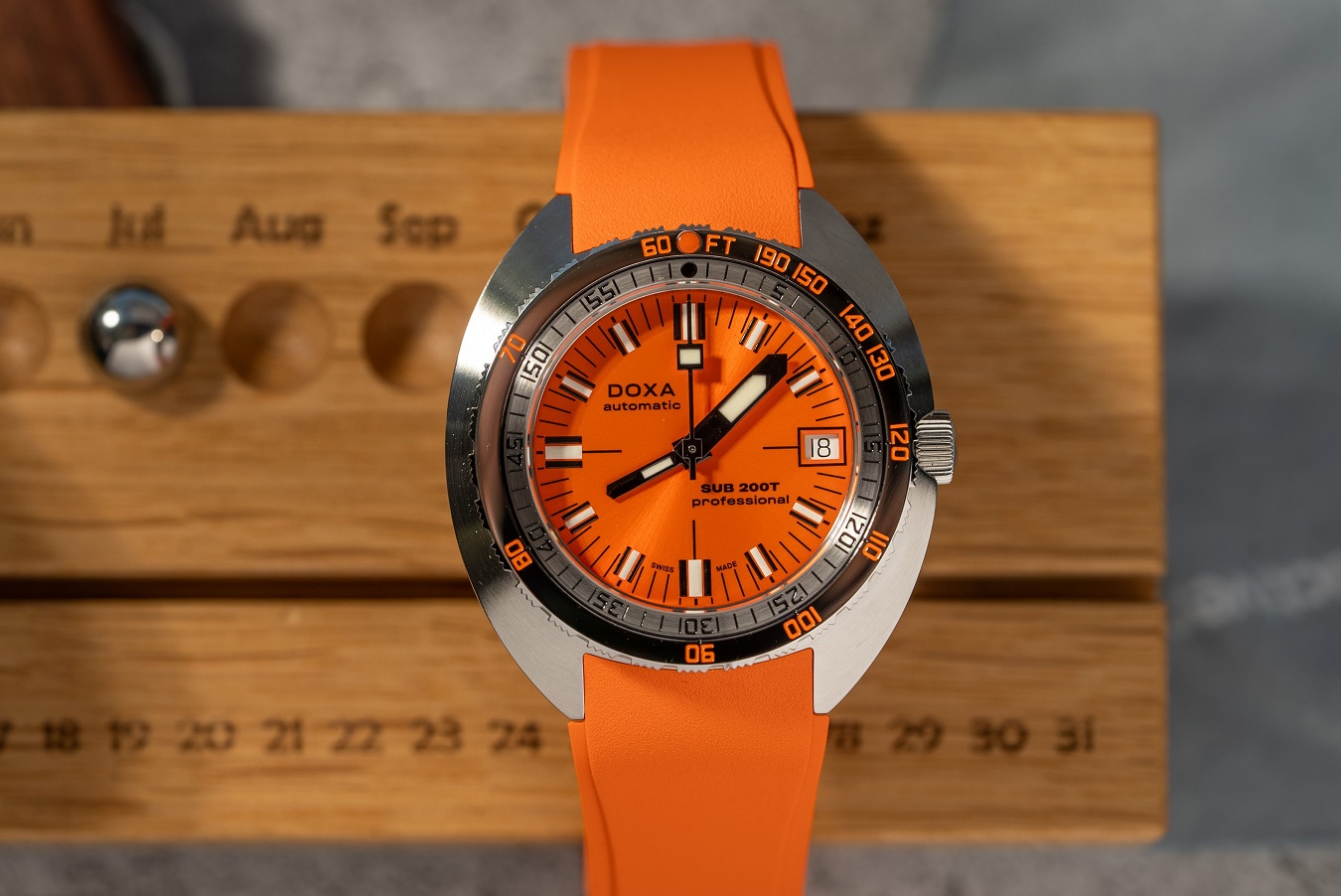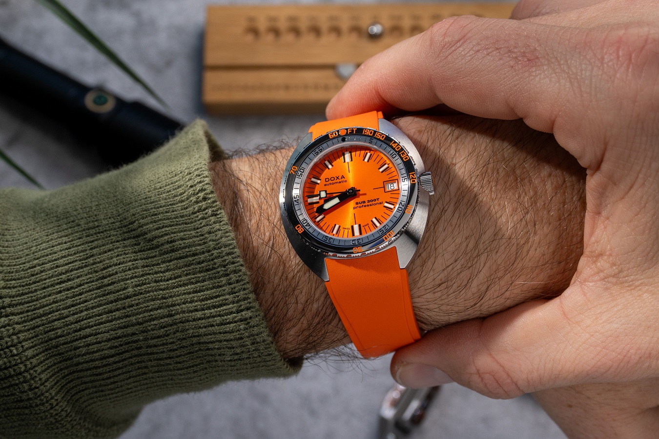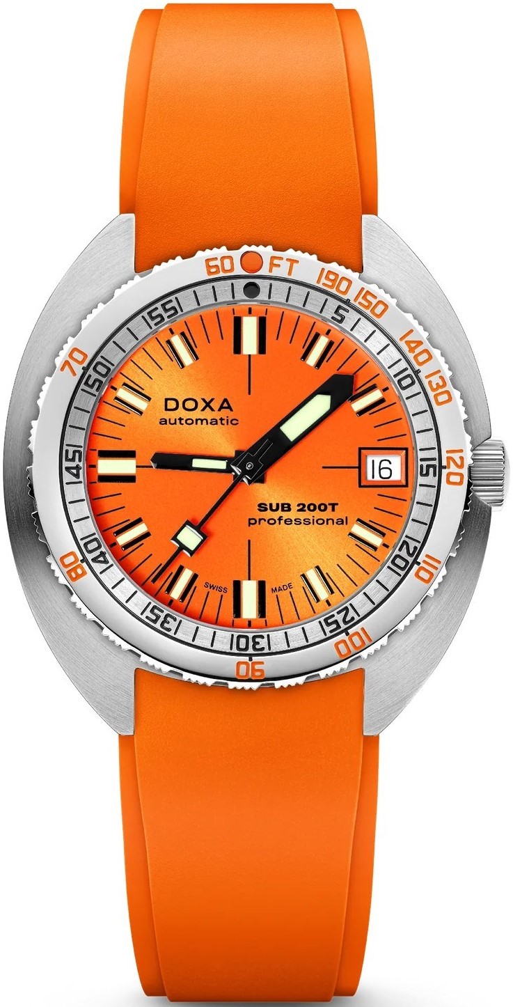 Doxa SUB 200T je model uvedený v roku 2024, avšak zároveň ide o hodinky, ktoré ťažia z celej novodobej histórie značky. Ide totiž o modernú a zmenšenú interpretáciu legendárneho modelu SUB 300, ktorý taktiež Doxa stále ponúka. Charakteristické puzdro vankúšikového tvaru tu dostalo priemer 39 milimetrov a môže sa pochváliť hrúbkou iba 10,7 milimetra. Doxa SUB 200T sú tak plnohodnotné potápačské hodinky vhodné aj pre užívateľov s menším zápästím. Dizajn hodiniek využíva všetky typické prvky legendárneho potápačského modelu 300. K siedmim výrazným farbám číselníkov, ktoré sú vôbec po prvýkrát dostupné nielen v matnom, ale aj v prevedení so sunburst efektom, pridáva Doxa aj ôsmu farbu - zelenú s názvom Sea Emerald. Model SUB 200T má aj typickú lunetu so zobrazením možnej hĺbky a času na potápanie bez dekompresie a výrazné rúčky pre maximálnu čitateľnosť pod hladinou. Samozrejmosťou je aj špičkové mechanické spracovanie a odolnosť voči vode do hĺbky 200 metrov. Okrem pre značku typického beads-of-rice oceľového náramku je možné modely 200T zaobstarať aj na gumovom remienku, ktorého farba ladí s číselníkom.