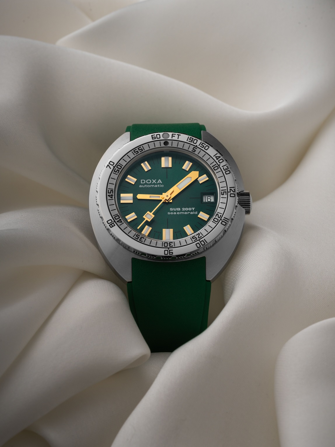 Doxa SUB 200T je model uvedený v roku 2024, avšak zároveň ide o hodinky, ktoré ťažia z celej novodobej histórie značky. Ide totiž o modernú a zmenšenú interpretáciu legendárneho modelu SUB 300, ktorý taktiež Doxa stále ponúka. Charakteristické puzdro vankúšikového tvaru tu dostalo priemer 39 milimetrov a môže sa pochváliť hrúbkou iba 10,7 milimetra. Doxa SUB 200T sú tak plnohodnotné potápačské hodinky vhodné aj pre užívateľov s menším zápästím. Dizajn hodiniek využíva všetky typické prvky legendárneho potápačského modelu 300. K siedmim výrazným farbám číselníkov, ktoré sú vôbec po prvýkrát dostupné nielen v matnom, ale aj v prevedení so sunburst efektom, pridáva Doxa aj ôsmu farbu - zelenú s názvom Sea Emerald. Model SUB 200T má aj typickú lunetu so zobrazením možnej hĺbky a času na potápanie bez dekompresie a výrazné rúčky pre maximálnu čitateľnosť pod hladinou. Samozrejmosťou je aj špičkové mechanické spracovanie a odolnosť voči vode do hĺbky 200 metrov. Okrem pre značku typického beads-of-rice oceľového náramku je možné modely 200T zaobstarať aj na gumovom remienku, ktorého farba ladí s číselníkom.