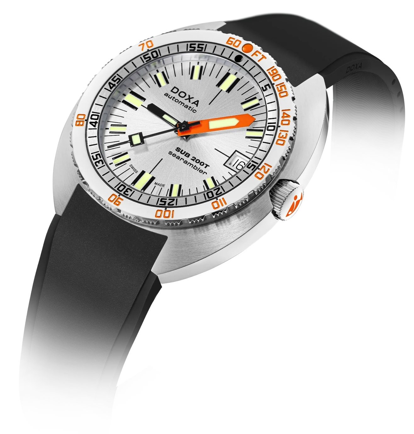 Doxa SUB 200T je model uvedený v roku 2024, avšak zároveň ide o hodinky, ktoré ťažia z celej novodobej histórie značky. Ide totiž o modernú a zmenšenú interpretáciu legendárneho modelu SUB 300, ktorý taktiež Doxa stále ponúka. Charakteristické puzdro vankúšikového tvaru tu dostalo priemer 39 milimetrov a môže sa pochváliť hrúbkou iba 10,7 milimetra. Doxa SUB 200T sú tak plnohodnotné potápačské hodinky vhodné aj pre užívateľov s menším zápästím. Dizajn hodiniek využíva všetky typické prvky legendárneho potápačského modelu 300. K siedmim výrazným farbám číselníkov, ktoré sú vôbec po prvýkrát dostupné nielen v matnom, ale aj v prevedení so sunburst efektom, pridáva Doxa aj ôsmu farbu - zelenú s názvom Sea Emerald. Model SUB 200T má aj typickú lunetu so zobrazením možnej hĺbky a času na potápanie bez dekompresie a výrazné rúčky pre maximálnu čitateľnosť pod hladinou. Samozrejmosťou je aj špičkové mechanické spracovanie a odolnosť voči vode do hĺbky 200 metrov. Okrem pre značku typického beads-of-rice oceľového náramku je možné modely 200T zaobstarať aj na gumovom remienku, ktorého farba ladí s číselníkom.