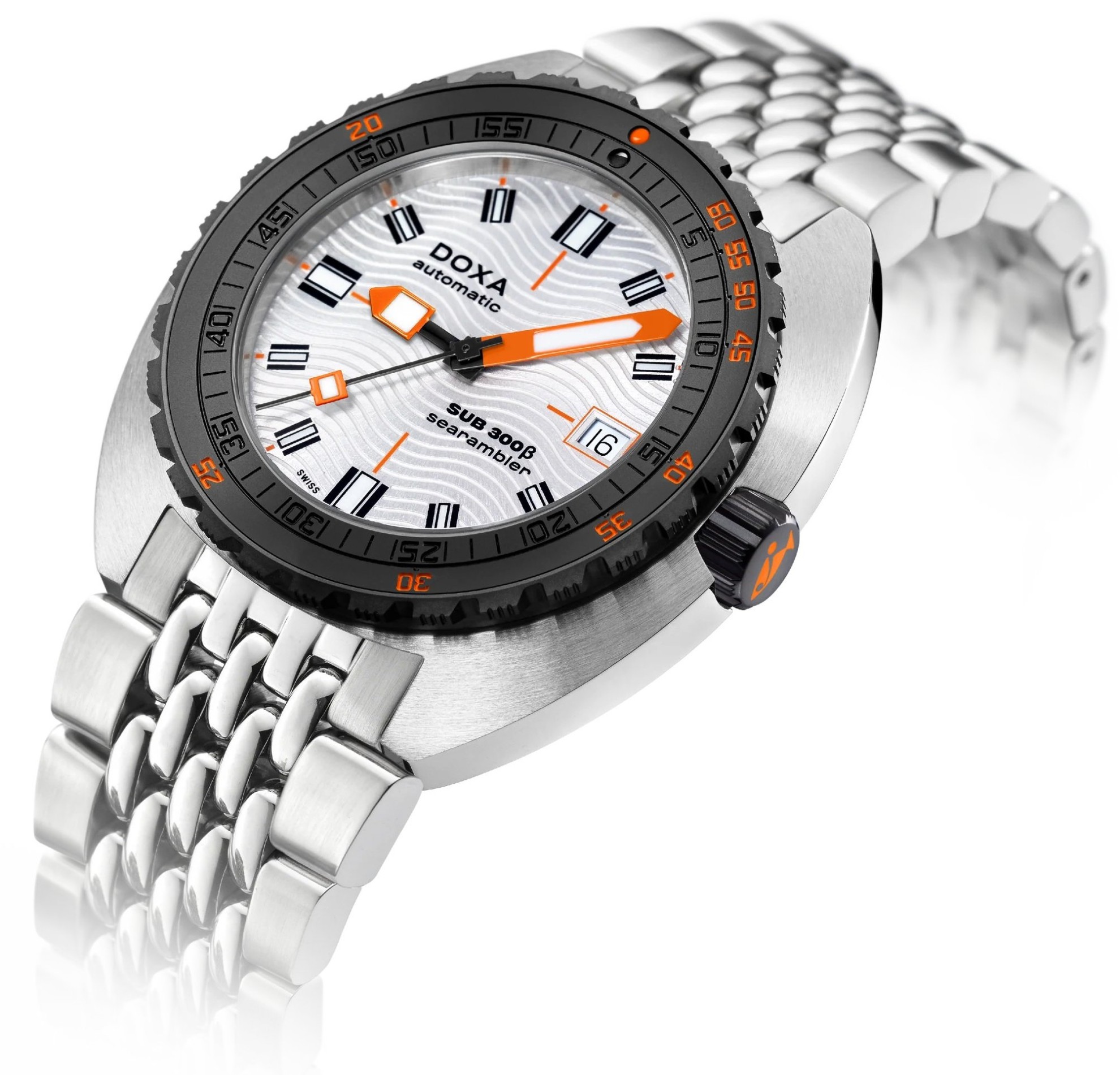 Doxa SUB 300β Searambler 830.10.021.10 sú pánske automatické potápačské hodinky na oceľovom „beads of rice“ náramku s preklápacou sponou, ktorý svoj názov získal preto, že jeho stredové dieliky pripomínajú zrnká. Puzdro z nerezovej ocele má priemer 42,5 milimetra, skrutkovaciu korunku, héliový ventil a čiernu keramickú jednosmerne otočnú lunetu s dvojitou stupnicou. Strieborný číselník s efektom slnečného brusu, textúrou vĺn a ukazovateľom dátumu na tretej hodine je chránený odolným zafírovým sklom s antireflexnou vrstvou. Ručičky a indexy pokrýva luminiscenčný náter SuperLuminova®, ktorý po nasvietení garantuje perfektnú čitateľnosť za zhoršených svetelných podmienok. Pohon hodiniek zaisťuje mechanický strojček s automatickým náťahom a rezervou chodu 38 hodín. S vodotesnosťou 30 ATM sú hodinky vhodné na hlbinné potápanie.