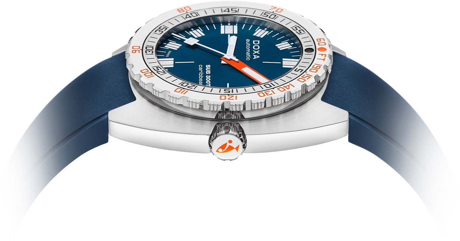 Aj vďaka spomínanému héliovému ventilu potom hodinky disponujú odolnosťou voči vode do hĺbky 1200 metrov vodného stĺpca. Typická luneta so stupnicou pre odpočet bezpečných časov potápania bez dekompresie je ciachovaná v stopách a modely v siedmich charakteristických farbách sú opäť k dispozícii na oceľovom náramku alebo gumovom remienku. Okrem týchto prevedení potom Doxa ponúka ešte verziu 300T Clive Cussler, ktorá nesie meno legendárneho spisovateľa a objaviteľa. Tento variant má špeciálne patinované puzdro aj náramok.