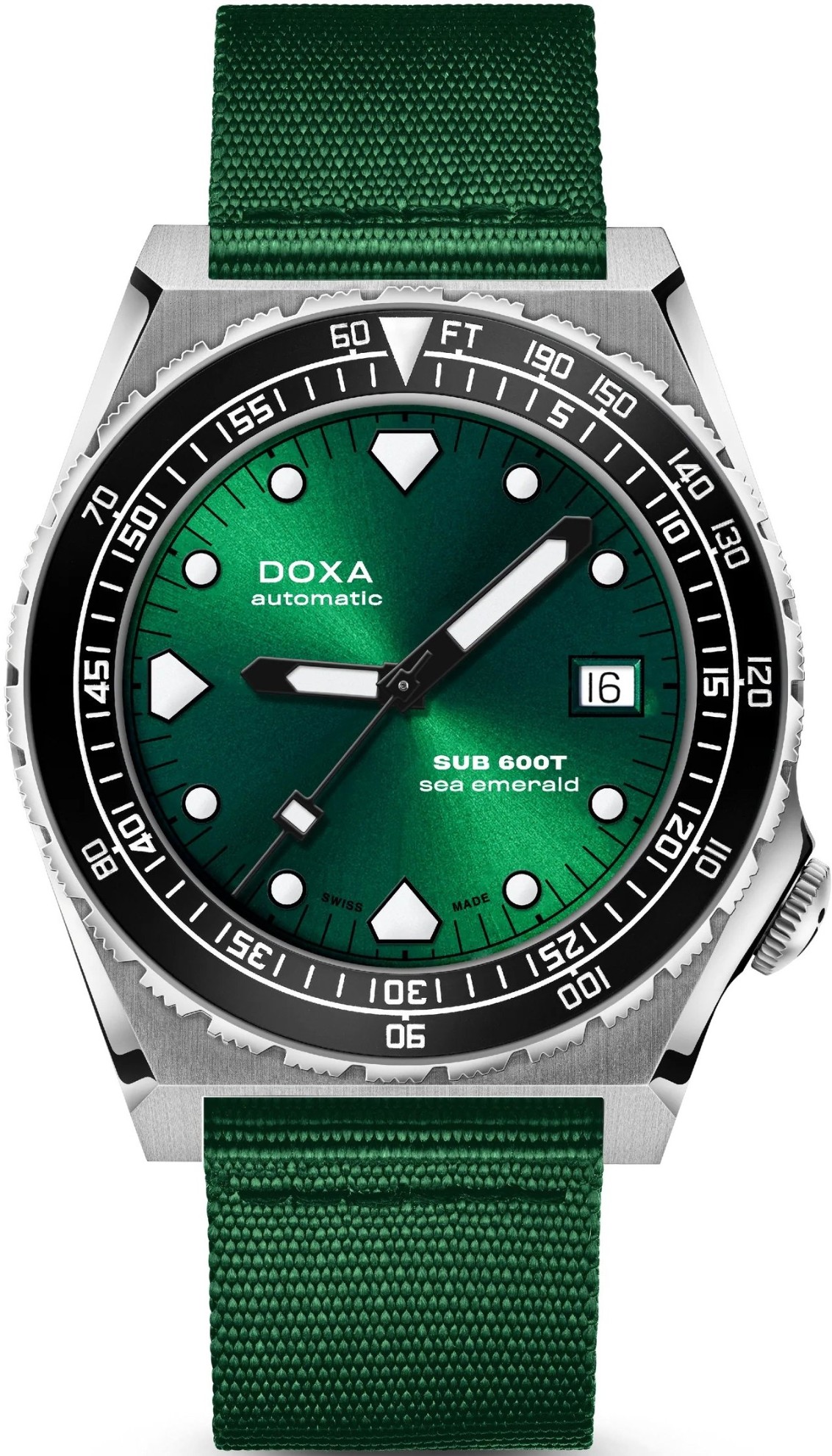Doxa SUB 600T Sea Emerald 861.10.131.26-N sú pánske športové automatické hodinky na zelenom NATO remienku s tŕňovou sponou. Puzdro z nehrdzavejúcej ocele má priemer 40 milimetrov, skrutkovaciu korunku a jednosmerne otočnú lunetu s čiernou keramickou vložkou s dvojitou stupnicou. Minútová stupnica na zobrazenie času ponoru a stopová stupnica na hĺbku. Zelený číselník s efektom slnečného brusu, ukazovateľom dátumu a tromi indexmi v tvare žraločieho zubu je chránený odolným zafírovým sklom. Ručičky a indexy pokrýva luminiscenčný náter SuperLuminova®, ktorý po nasvietení garantuje dokonalú čitateľnosť v zhoršených svetelných podmienkach. Pohon hodín zabezpečuje mechanický strojček s automatickým náťahom a rezervou chodu 38 hodín. S vodotesnosťou 60 ATM sú hodinky vhodné na prístrojové potápanie.