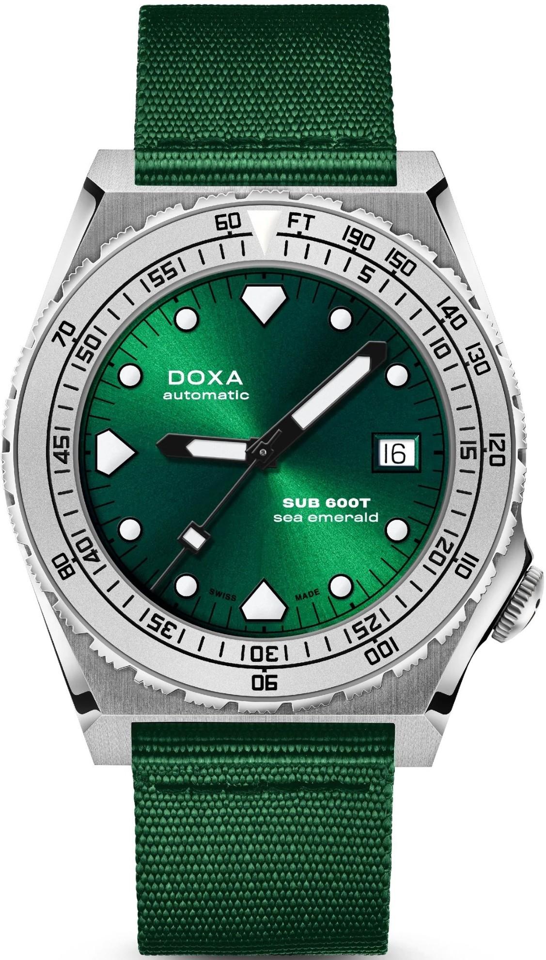 Doxa SUB 600T Sea Emerald 862.10.131.26-N sú pánske automatické potápačské hodinky na zelenom NATO remienku s tŕňovou sponou. Puzdro z nehrdzavejúcej ocele má priemer 40 milimetrov, skrutkovaciu korunku a jednosmerne otočnú lunetu s oceľovou pieskovanou vložkou s dvojitou stupnicou. Minútová stupnica na zobrazenie doby pobytu pod vodou a stopová stupnica na hĺbku. Zelený číselník s efektom slnečného brusu, indikátorom dátumu a tromi indexmi v tvare žraločieho zubu je chránený odolným zafírovým sklom. Ručičky a indexy pokrýva luminiscenčný náter SuperLuminova®, ktorý po nasvietení garantuje dokonalú čitateľnosť v zhoršených svetelných podmienkach. Pohon hodín zabezpečuje mechanický strojček s automatickým náťahom a rezervou chodu 38 hodín. S vodotesnosťou 60 ATM sú hodinky vhodné na prístrojové potápanie.