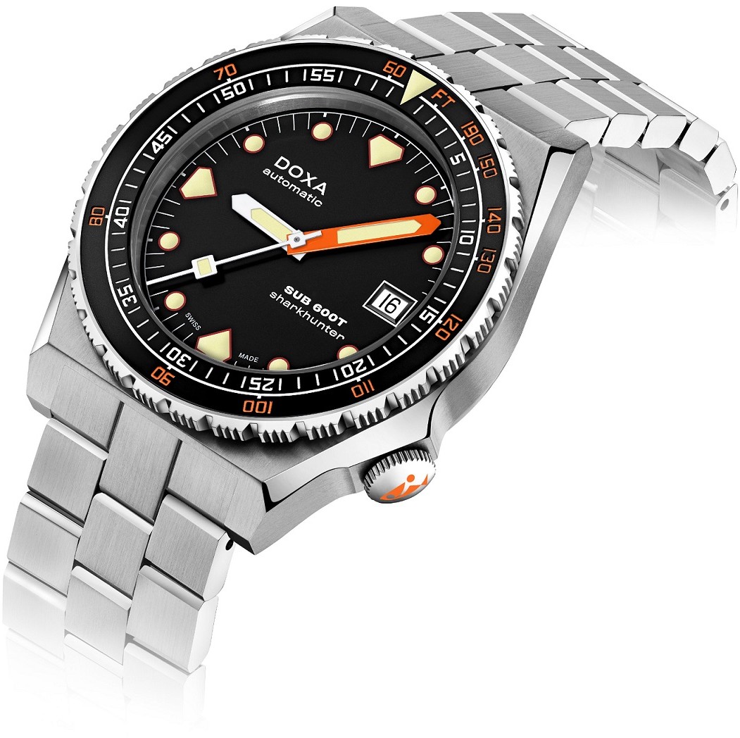 Doxa SUB 600T Sharkhunter 861.10.101.10 sú pánske automatické potápačské hodinky na oceľovom náramku s preklápacou sponou. Puzdro z nehrdzavejúcej ocele má priemer 40 milimetrov, skrutkovaciu korunku a jednosmerne otočnú lunetu s čiernou keramickou vložkou s dvojitou stupnicou. Minútová stupnica na zobrazenie doby ponoru a stopová stupnica na hĺbku. Čierny číselník s ukazovateľom dátumu a tromi indexmi v tvare žraločieho zubu je chránený odolným zafírovým sklom. Ručičky a indexy pokrýva luminiscenčný náter SuperLuminova®, ktorý po nasvietení garantuje dokonalú čitateľnosť v zhoršených svetelných podmienkach. Pohon hodín zabezpečuje mechanický strojček s automatickým náťahom a rezervou chodu 38 hodín. S vodotesnosťou 60 ATM sú hodinky vhodné na prístrojové potápanie.