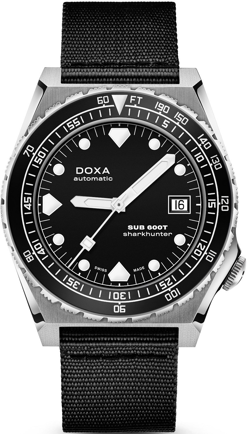 Doxa SUB 600T Sharkhunter 861.10.101B.20-N sú pánske športové automatické hodinky na čiernom NATO remienku s tŕňovou sponou. Puzdro z nehrdzavejúcej ocele má priemer 40 milimetrov, skrutkovaciu korunku a jednosmerne otočnú lunetu s čiernou keramickou vložkou s dvojitou stupnicou. Minútová stupnica na zobrazenie doby ponoru a stopová stupnica na hĺbku. Čierny číselník s ukazovateľom dátumu a tromi indexmi v tvare žraločieho zubu je chránený odolným zafírovým sklom. Ručičky a indexy pokrýva luminiscenčný náter SuperLuminova®, ktorý po nasvietení garantuje dokonalú čitateľnosť pri zhoršených svetelných podmienkach. Pohon hodín zabezpečuje mechanický strojček s automatickým náťahom a rezervou chodu 38 hodín. S vodotesnosťou 60 ATM sú hodinky vhodné na prístrojové potápanie.