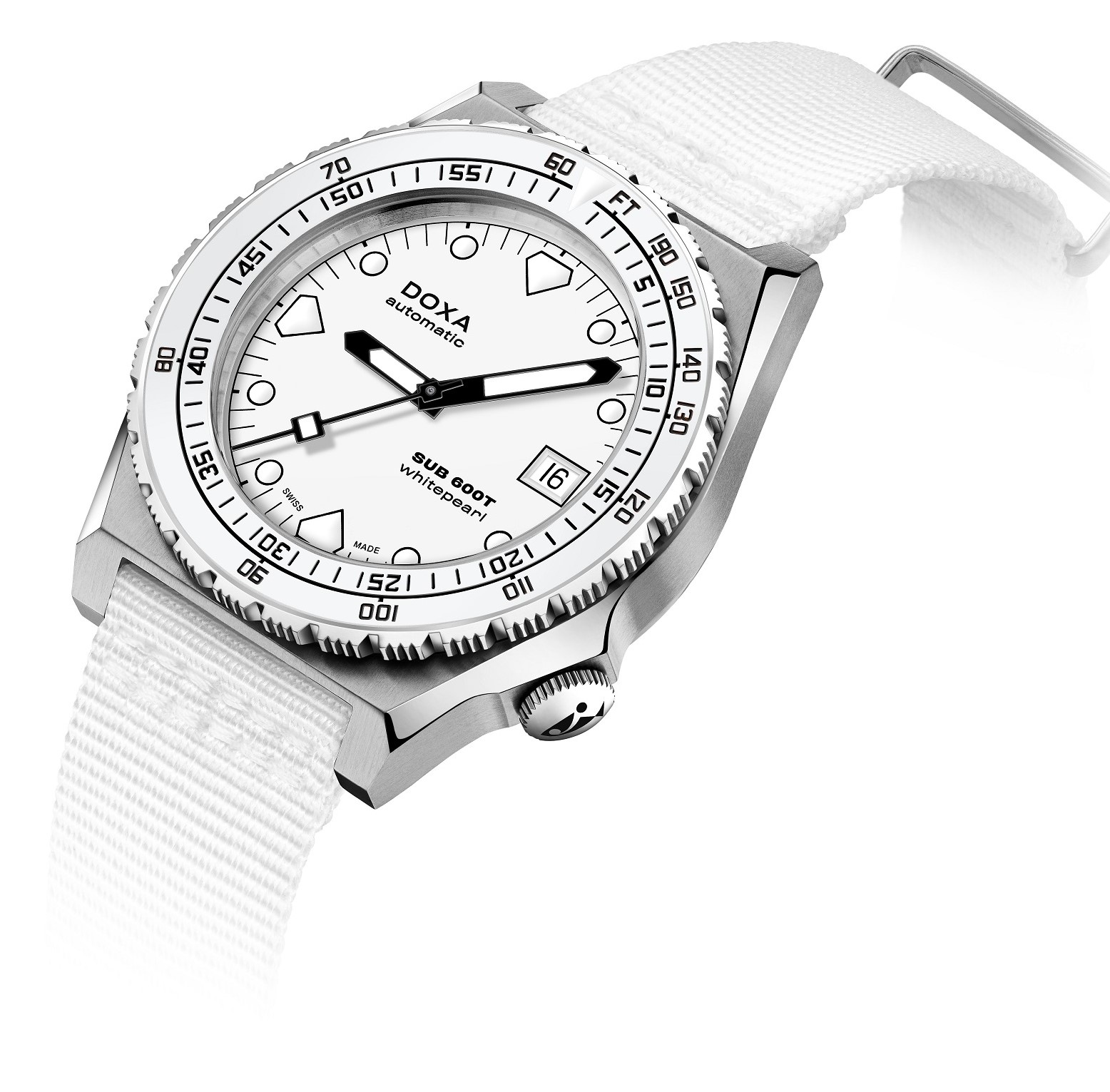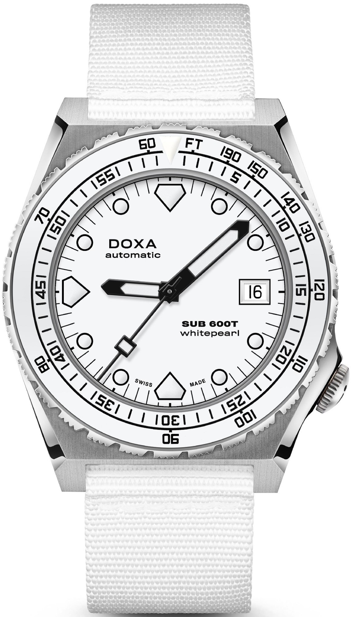 Doxa SUB 600T Whitepearl 861.10.011.23-N sú pánske športové automatické hodinky na bielom NATO remienku s tŕňovou sponou. Puzdro z nehrdzavejúcej ocele má priemer 40 milimetrov, skrutkovaciu korunku a jednosmerne otočnú lunetu s bielou keramickou vložkou s dvojitou stupnicou. Minútová stupnica na zobrazenie doby ponoru a stopová stupnica na hĺbku. Biely číselník s ukazovateľom dátumu a tromi indexmi v tvare žraločieho zubu je chránený odolným zafírovým sklom. Ručičky a indexy pokrýva luminiscenčný náter SuperLuminova®, ktorý po nasvietení garantuje dokonalú čitateľnosť v zhoršených svetelných podmienkach. Pohon hodín zabezpečuje mechanický strojček s automatickým náťahom a rezervou chodu 38 hodín. S vodotesnosťou 60 ATM sú hodinky vhodné na prístrojové potápanie.