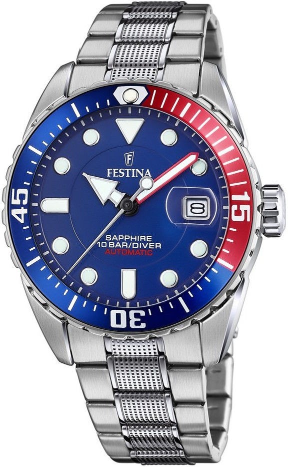 Festina Automatic 20480/1 sú pánske klasické mechanické hodinky na oceľovom náramku s preklápacou sponou. Puzdro z nerezovej ocele má priemer 41 milimetrov a červeno-modrú lunetu s minútovou stupnicou. Modrý číselník je chránený zafírovým sklíčkom s lupou nad apertúrou dátumu. Ručičky a indexy disponujú luminiscenčným náterom, ktorý po nasvietení uľahčuje čitateľnosť za zhoršených svetelných podmienok. Pohon hodiniek zaisťuje mechanický strojček Miyota 8215 s automatickým náťahom a rezervou chodu až 42 hodín. S vodotesnosťou 10 ATM sú hodinky vhodnou voľbou na plávanie a šnorchlovanie.