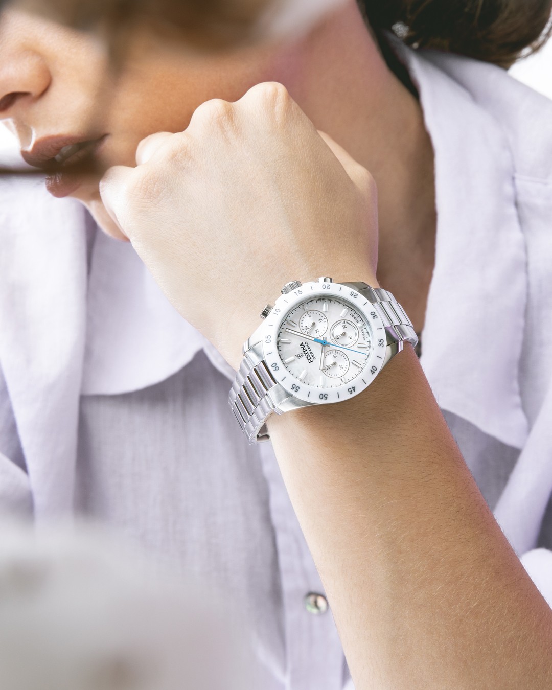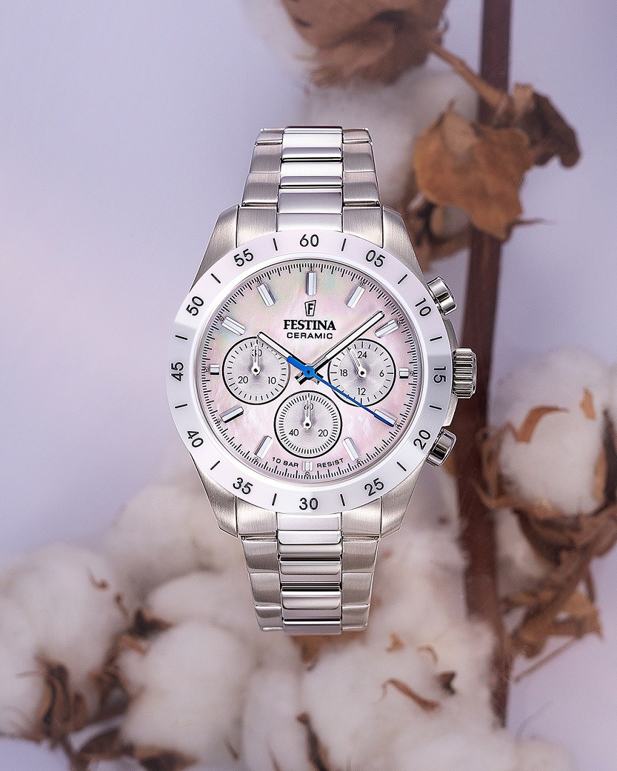 Festina Ceramic 20693/1 sú dámske športové quartzové hodinky s oceľovým náramkom s preklápacou sponou. Puzdro z nerezovej ocele má priemer 39 milimetrov a bielu keramickú lunetu s minútovou stupnicou. Perleťový číselník so striebornými subciferníkmi chronografu a ukazovateľom času v 24hodinovom formáte je chránený odolným minerálnym sklom a jeho krása vyniká najmä pod priamym svetlom, kedy môžeme pozorovať hru farieb perlete. Aplikované indexy majú spolu s ručičkami luminiscenčný náter, ktorý po nasvietení uľahčuje čitateľnosť za zhoršených svetelných podmienok. Pohon zaisťuje quartzový strojček Miyota JS20 s presnosťou ±20 sekúnd za mesiac. Vodotesnosť hodiniek je 10 ATM a sú vhodné na plávanie alebo šnorchlovanie.