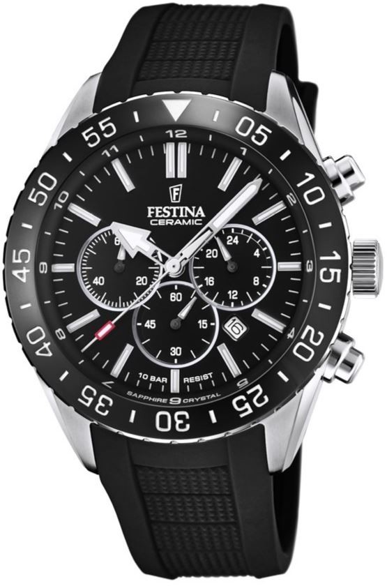 Festina Ceramic 20515/2 sú pánske športové quartzové hodinky na silikónovom remienku čiernej farby. Puzdro z nerezovej ocele má priemer 44 milimetrov a keramickú lunetu s minútovou stupnicou. Čierny číselník so strieborno orámovanými subčíselníkmi je chránený odolným zafírovým sklom. Aplikované indexy majú spolu s ručičkami luminiscenčný náter, ktorý po nasvietení uľahčuje čitateľnosť za zhoršených svetelných podmienok. Pohon zaisťuje quartzový strojček Miyota 0S20 s mimostrednou priebežnou sekundovou ručičkou na pozícii 6. hodiny, s ukazovateľom času v 24hodinovom formáte na pozícii 3. hodiny a s minútovým čítačom stopiek na 9. hodine. Nechýba ani okienko dátumovky. Vodotesnosť hodiniek je 10 ATM a sú vhodné na kúpanie alebo šnorchlovanie.