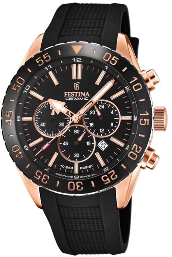 Festina Ceramic 20516/2 sú pánske športové quartzové hodinky na silikónovom remienku čiernej farby. Puzdro z nerezovej ocele s PVD úpravou vo farbe ružového zlata má priemer 44 milimetrov, keramickú lunetu s minútovou stupnicou a spolu s tlačidlami stopiek, korunku a prvkami na lunete farebne korešponduje s ručičkami, indexmi a rámovaním subčíselníkov na modrom číselníku chráneným odolným zafírovým sklom. Aplikované indexy majú spolu s ručičkami luminiscenčný náter, ktorý po nasvietení uľahčuje čitateľnosť za zhoršených svetelných podmienok. Pohon zaisťuje quartzový strojček Miyota 0S20 s mimostrednou priebežnou sekundovou ručičkou na pozícii 6. hodiny, s ukazovateľom času v 24hodinovom formáte na pozícii 3. hodiny a s minútovým čítačom stopiek na 9. hodine. Nechýba ani okienko dátumovky. Vodotesnosť hodiniek je 10 ATM a sú vhodné na kúpanie alebo šnorchlovanie.