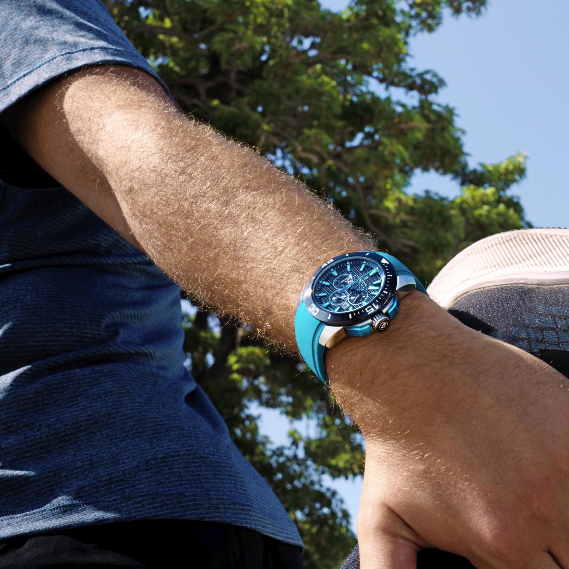Festina Chrono Bike 20642/3 sú pánske športovné quartzové hodinky s tyrkysový silikonovým remienkom stelesňujúce spojenie vycibrenej estetiky a pokročilé funkčnosti. Puzdro z nerezovej ocele má priemer 47 milimetrov a lunetu s minútovou stupnicou. Čierny číselník je chránený odolným minerálnym sklom. Aplikované indexy majú spolu s ručičkami luminiscenčný náter, ktorý po nasvietení uľahčuje čitateľnosť za zhoršených svetelných podmienok. Pohon hodiniek zaisťuje batériový strojček Miyota 0S20 s mimostrednou priebežnou sekundovou ručičkou na pozícii 6. hodiny, s ukazovateľom času v 24hodinovom formáte na pozícii 3. hodiny a s minútovým čítačom stopiek na 9. hodine. Nechýba ani okienko dátumovky. Vodotesnosť hodiniek je 10 ATM a sú vhodné na kúpanie alebo šnorchlovanie.