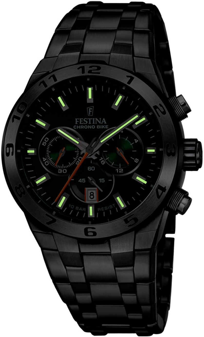 Festina Chrono Bike 20670/2 sú pánske športové quartzové hodinky na kovovom náramku stelesňujúce spojenie vycibrenej estetiky a pokročilej funkčnosti. Puzdro z nerezovej ocele má priemer 44,5 milimetra a lunetu s hodinovou stupnicou. Zelený číselník s oranžovými a čiernymi detailmi je chránený odolným minerálnym sklom. Aplikované indexy majú spolu s ručičkami luminiscenčný náter, ktorý po nasvietení uľahčuje čitateľnost za zhoršených svetelných podmienok. Pohon hodiniek zaisťuje batériový strojček Miyota 0S20 s mimostrednou priebežnou sekundovou ručičkou na pozícii 6. hodiny, s ukazovateľom času v 24hodinovom formáte na pozícii 3. hodiny a s minútovým čítačom stopiek na 9. hodine. Nechýba ani okienko dátumovky. Vodotesnosť hodiniek je 10 ATM a sú  vhodné na kúpanie alebo šnorchlovanie.