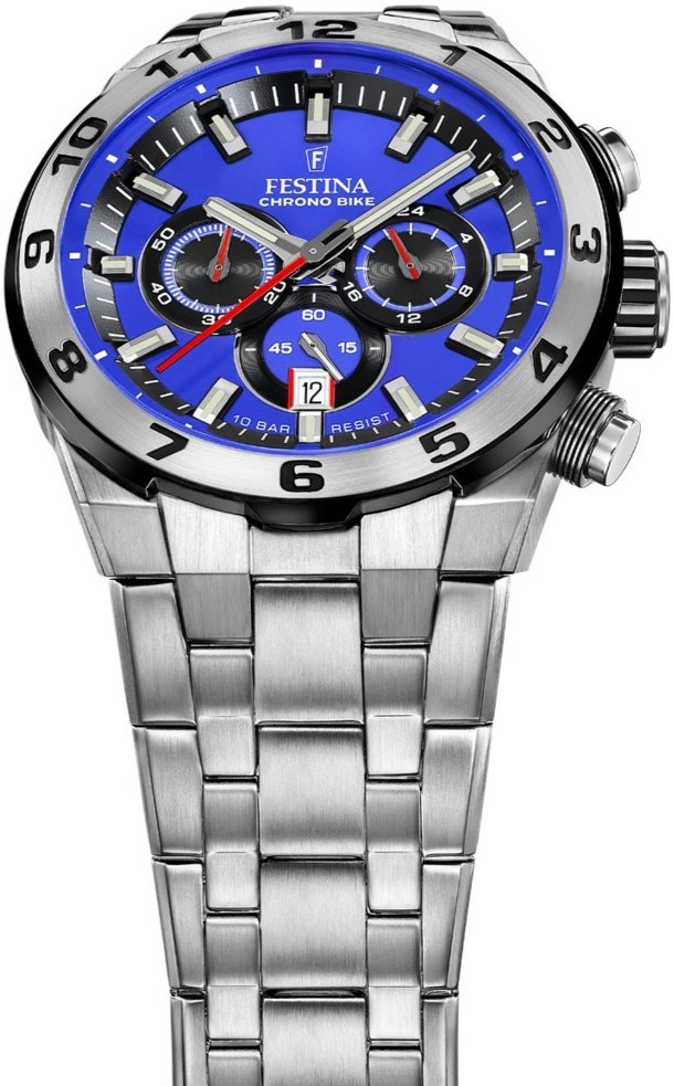 Festina Chrono Bike 20670/3 sú pánske športové quartzové hodinky na kovovom náramku stelesňujúce spojenie vycibrenej estetiky a pokročilej funkčnosti. Puzdro z nerezovej ocele má priemer 44,5 milimetra a lunetu s hodinovou stupnicou. Žiarivo modrý číselník s červenými detailmi je chránený odolným minerálnym sklom. Aplikované indexy majú spolu s ručičkami luminiscenčný náter, ktorý po nasvietení uľahčuje čitateľnost za zhoršených svetelných podmienok. Pohon hodiniek zaisťuje batériový strojček Miyota 0S20 s mimostrednou priebežnou sekundovou ručičkou na pozícii 6. hodiny, s ukazovateľom času v 24hodinovom formáte na pozícii 3. hodiny a s minútovým čítačom stopiek na 9. hodine. Nechýba ani okienko dátumovky. Vodotesnosť hodiniek je 10 ATM a sú  vhodné na kúpanie alebo šnorchlovanie.
