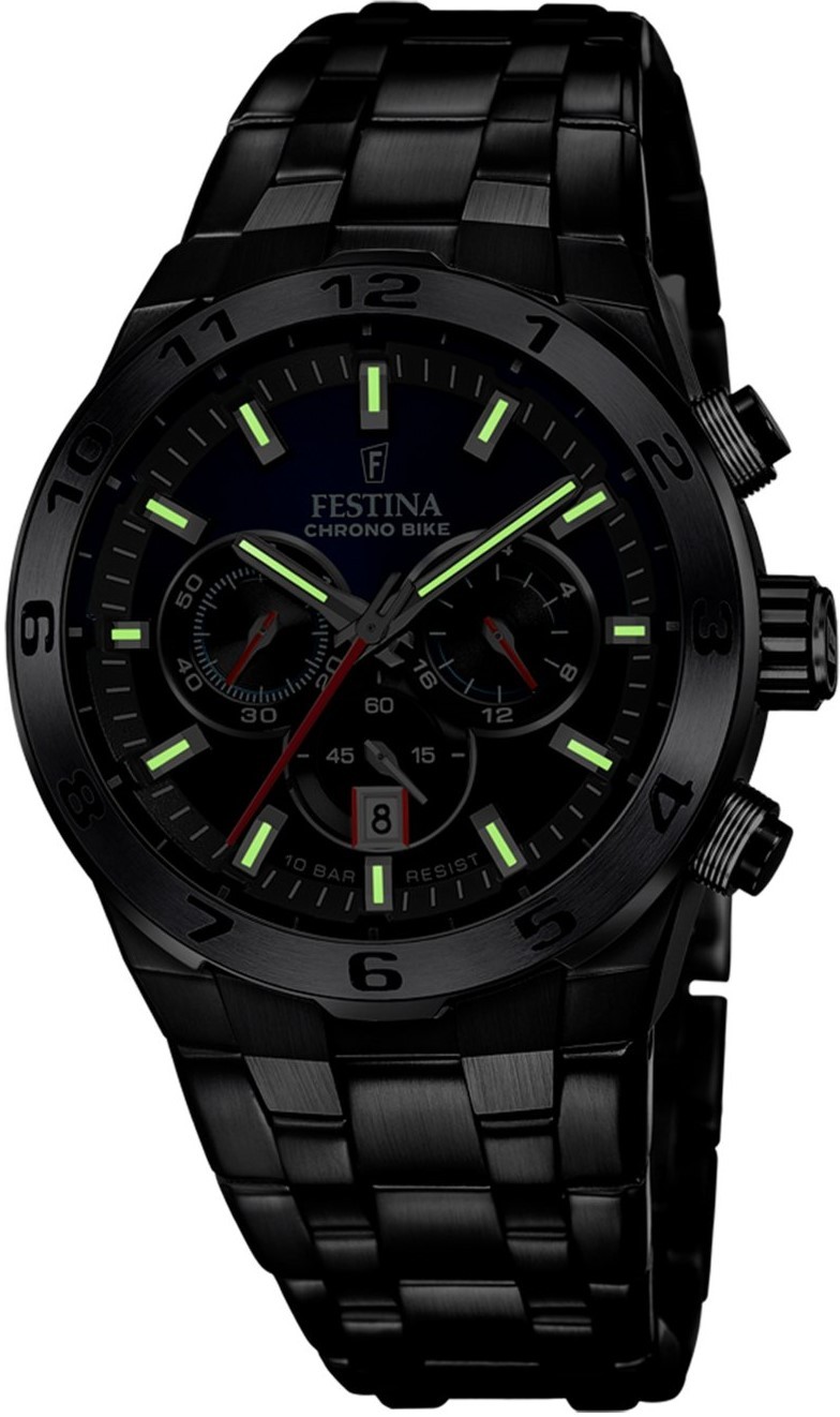 Festina Chrono Bike 20673/1 sú pánske športové quartzové hodinky na kovovom náramku s čiernou PVD úpravou stelesňujúcou spojenie vycibrenej estetiky a pokročilej funkčnosti. Puzdro z nerezovej ocele v rovnakej farbe má priemer 44,5 milimetra a lunetu s hodinovou stupnicou. Modro-čierny číselník s červenými detailmi je chránený odolným minerálnym sklom. Aplikované indexy majú spolu s ručičkami luminiscenčný náter, ktorý po nasvietení uľahčuje čitateľnosť za zhoršených svetelných podmienok. Pohon hodiniek zaisťuje batériový strojček Miyota 0S20 s mimostrednou priebežnou sekundovou ručičkou na pozícii 6. hodiny, s ukazovateľom času v 24hodinovom formáte na pozícii 3. hodiny a s minútovým čítačom stopiek na 9. hodine. Nechýba ani okienko dátumovky. Vodotesnosť hodiniek je 10 ATM a sú vhodné na kúpanie alebo šnorchlovanie. Súčasťou balenia je náhradný silikónový čierno-modrý remienok.