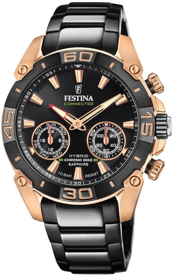 Festina Chrono Bike Connected 20548/1 sú pánske inteligentné športové quartzové hodinky na kovovom náramku s čiernou PVD úpravou stelesňujúcu spojenie vycibrenej estetiky a pokročilej funkčnosti. Puzdro z nerezovej ocele v rovnakej farbe má priemer 45,5 milimetrov a lunetu s minútovou stupnicou. Čierny číselník s červenými detailmi je chránený odolným zafírovým sklom. Vodotesnosť hodiniek je 10 ATM a sú vhodné na kúpanie alebo šnorchlovanie. Hodinky je možné prepojiť s vašim smartphonom pomocou aplikácie Festina Connected, ktorá je k dispozícii pre systémy Android a iOS. Vynikajú tým, že na prvý pohľad nepôsobia ako bežné inteligentné hodinky, avšak môžu ponúknuť hned 17 užitočných funkcií podrobne popísaných nižšie. Patria medzi ne napr.: Bluetooth, krokomer, timer, stopky, budík a mnoho ďalších. Batéria má životnosť cez dva roky. Vzhľad hodiniek sa dá navyše ľahko meniť vďaka silikónovému remienku s maskáčovým vzorom, ktorý je súčasťou balenia.