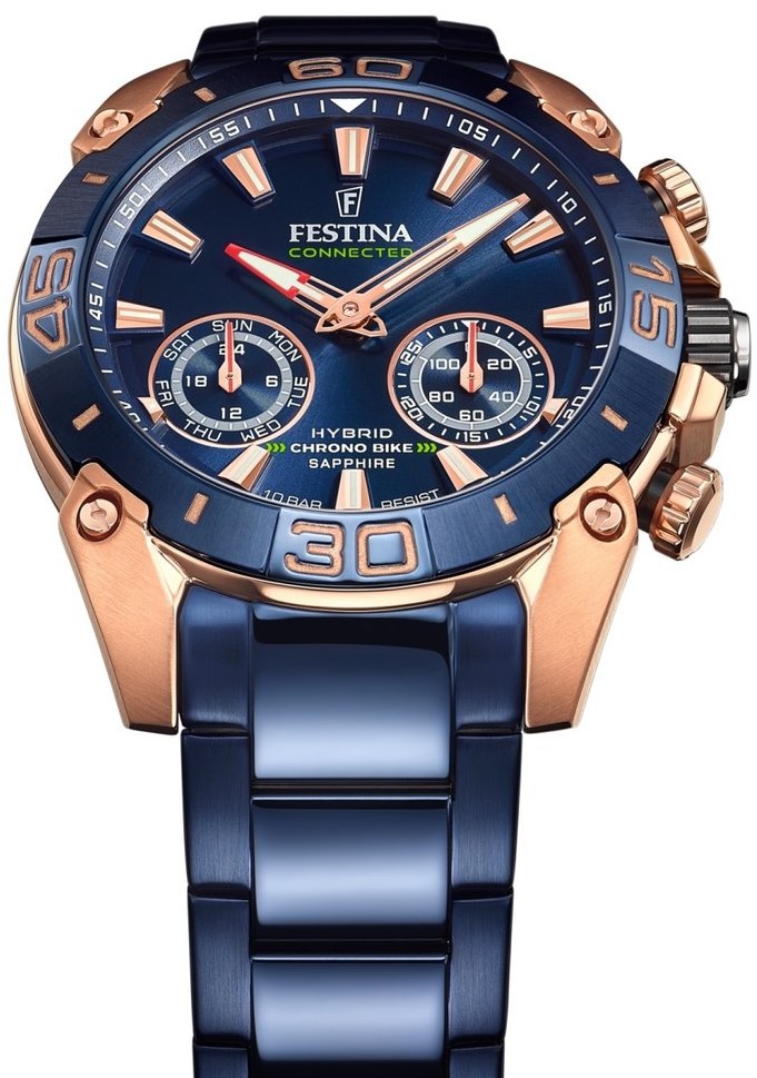 Festina Chrono Bike Connected 20549/1 sú pánske inteligentné športové quartzové hodinky na kovovom náramku s čiernou PVD úpravou stelesňujúcu spojenie vycibrenej estetiky a pokročilej funkčnosti. Puzdro z nerezovej ocele v rovnakej farbe má priemer 45,5 milimetrov a lunetu s minútovou stupnicou. Modrý číselník s červenými detailmi je chránený odolným zafírovým sklom. Vodotesnosť hodiniek je 10 ATM a sú vhodné na kúpanie alebo šnorchlovanie. Hodinky je možné prepojiť s vašim smartphonom pomocou aplikácie Festina Connected, ktorá je k dispozícii pre systémy Android a iOS. Vynikajú tým, že na prvý pohľad nepôsobia ako bežné inteligentné hodinky, avšak môžu ponúknuť hned 17 užitočných funkcií podrobne popísaných nižšie. Patria medzi ne napr.: Bluetooth, krokomer, timer, stopky, budík a mnoho ďalších. Batéria má životnosť cez dva roky. Vzhľad hodiniek sa dá navyše ľahko meniť vďaka modrému silikónovému remienku s maskáčovým vzorom, ktorý je súčasťou balenia.
