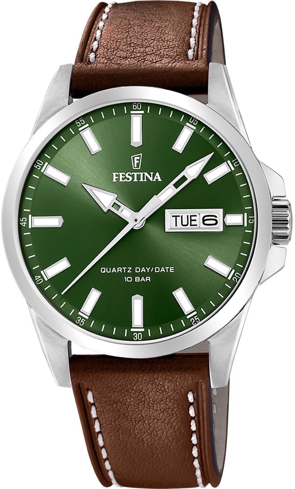 Festina Classics 20358/5 sú pánske elegantné batériové hodinky na hnedom koženom remienku s kontrastným prešívaním a tŕňovou sponou. Puzdro z nerezovej ocele má priemer 41 milimetrov. Zelený číselník s efektom slnečného brusu a ukazovateľom dňa a dátumu na tretej hodine je chránený odolným minerálnym sklíčkom. Ručičky majú luminiscenčný náter, ktorý po nasvietení uľahčuje čitateľnosť za zhoršených svetelných podmienok. Chod hodiniek zaisťuje quartzový strojček Miyota 1S02 s presnosťou ±20 sekúnd za mesiac. S vodotesnosťou 10 ATM sú hodinky vhodné na plávanie či šnorchlovanie.