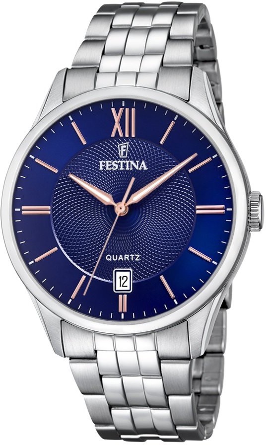 Festina Classics 20425/5 sú pánske batériové hodinky v klasickom štýle na oceľovom náramku s preklápacou sponou. Puzdro z nerezovej ocele má priemer 43 milimetrov. Tmavo modrý číselník s radiálnou štruktúrou a ukazovateľom dátumu na šiestej hodine je chránený odolným minerálnym sklíčkom. Ručičky majú luminiscenčný náter, ktorý po nasvietení uľahčuje čitateľnosť za zhoršených svetelných podmienok. Chod hodiniek zaisťuje quartzový strojček Miyota 2415 s presnosťou ±20 sekúnd za mesiac. S vodotesnosťou 5 ATM sú hodinky odolné proti dažďu a pri sprchovaní.