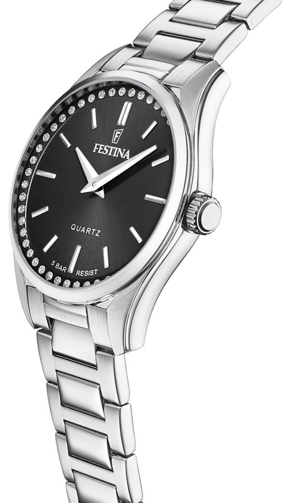 Festina Mademoiselle 20583/4 sú dámske batériové hodinky v klasickom štýle na oceľovom náramku s preklápacou sponou. Puzdro z nerezovej ocele má priemer 35,5 milimetra. Čierny číselník s efektom slnečného brusu zdobený čírymi zirkónmi po obvode je chránený odolným minerálnym sklíčkom. Pohon hodiniek zaisťuje quartzový strojček Miyota 2025-H1 s presnosťou ±20 sekúnd za mesiac. S vodotesnosťou 5 ATM sú hodinky odolné proti dažďu a pri sprchovaní.