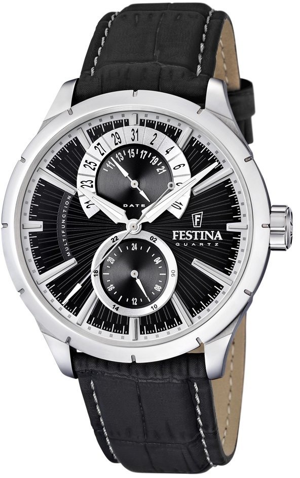 Festina Retro 16573/3 sú pánske elegantné batériové hodinky na modrom koženom remienku s tŕňovou sponou. Puzdro z nerezovej ocele má priemer 46 milimetrov. Čierny číselník s radiálnou štruktúrou, ukazovateľom dátumu a zobrazením času v 24hodinovom formáte je chránený minerálnym sklíčkom. Hodinky poháňa quartzový strojček Miyota 6P73. S vodotesnosťou 5 ATM sú odolné proti dažďu a pri sprchovaní.