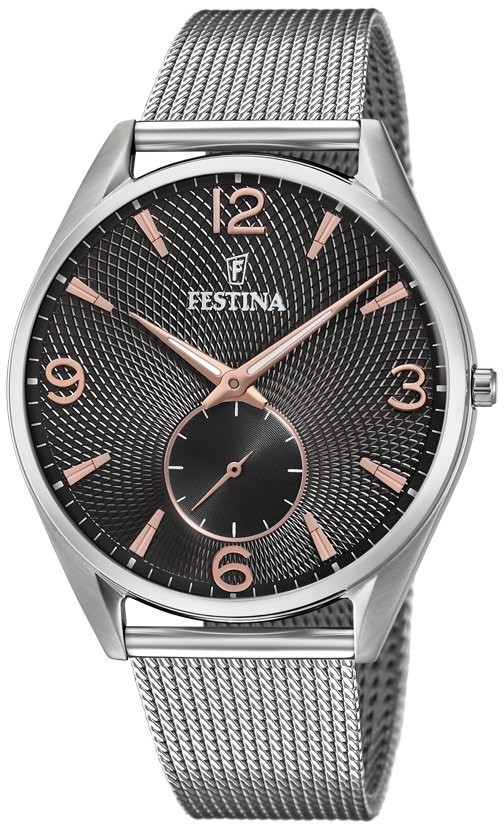 Festina Retro 6869/3 sú pánske elegantné batériové hodinky na oceľovom milánskom ťahu s posuvnou sponou. Puzdro z nerezovej ocele má priemer 41,5 milimetra. Čierny číselník s radiálnou štruktúrou a malou sekundovou ručičkou na šiestej hodine je chránený minerálnym sklíčkom. Ručičky disponujú luminiscenčným náterom, ktorý zaisťuje lepšiu čitateľnosť za horších svetelných podmienok. Hodinky poháňa quartzový strojček Miyota 1L45 s presnosťou ±20 sekúnd za mesiac. S vodotesnosťou 3 ATM sú hodinky odolné proti dažďu a pri umývaní rúk.