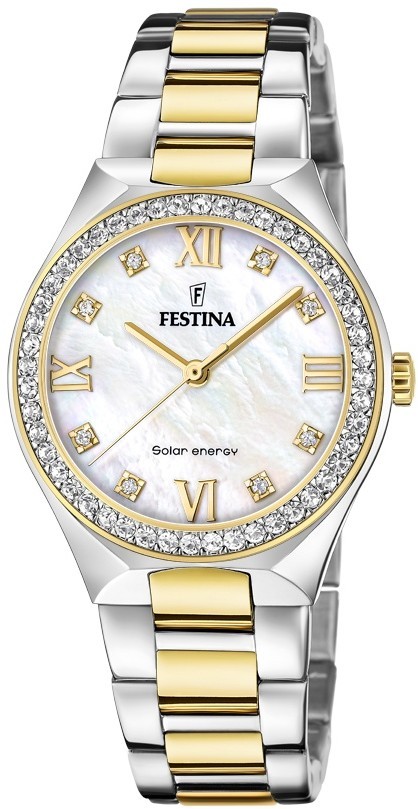 Festina Solar Energy 20659/1 sú dámske klasické hodinky na oceľovom bicolor náramku s preklápacou sponou. Puzdro z nerezovej ocele má priemer 35 milimetrov. Stredové dieliky náramku, luneta a korunka sú opatrené PVD úpravou vo farbe zlata. Lunetu a číselník zdobia číre zirkóny. Perleťový číselník je chránený odolným minerálnym sklíčkom a jeho krása vyniká najmä pod priamym svetlom, kedy môžeme sledovať hru farieb perleti. Pohon hodiniek zaisťuje batériový strojček Miyota 2070 so solárnym napájaním a presnosťou ±20 sekúnd za mesiac. Vodeodolnosť hodiniek je 5 ATM a sú odolné proti dažďu a pri sprchovaní.